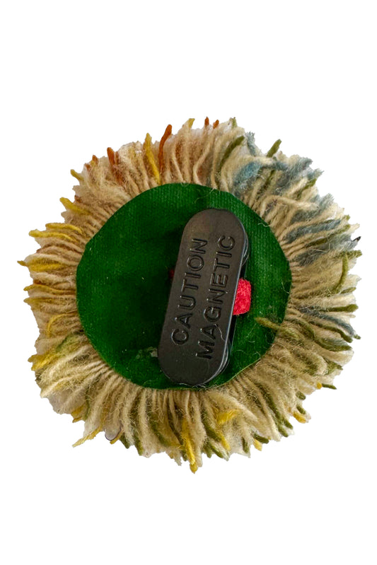 Leather & Wool Flower Magnetic Brooch - Green, Gold & Red Fringe
