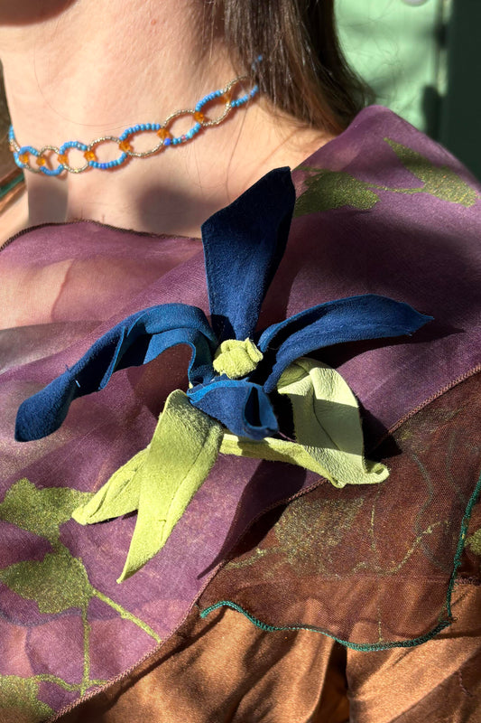 Leather Flower Magnetic Brooch - Blue & Green Orchid