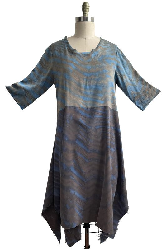 Marais Dress in Stretch Silk & Crepe De Chine - Shibori Arashi - Blue & Grey - M/L