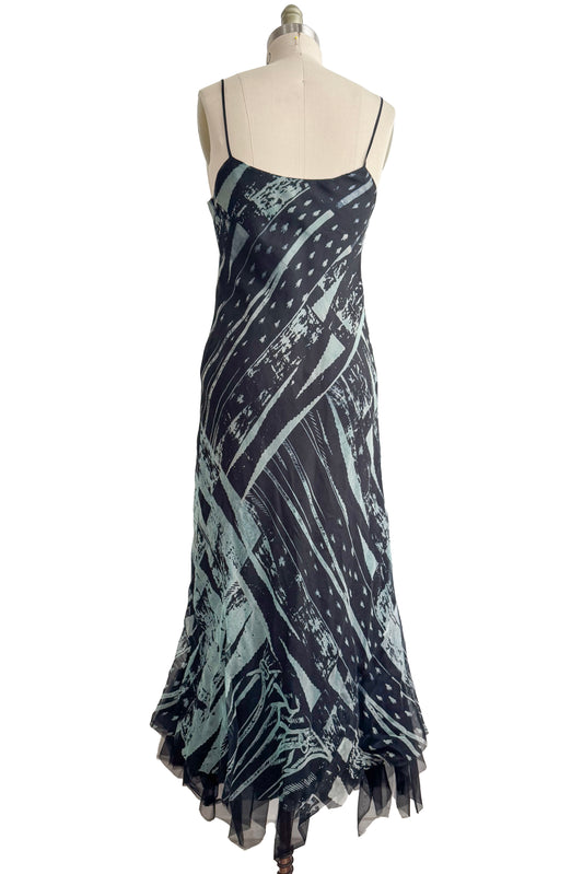 Kappa Dress in Silk w/Organza Trim & Brass Print - Black & Aqua - Small
