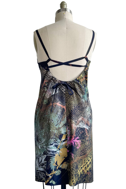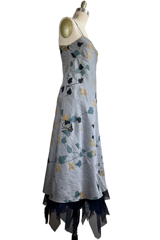 Kappa Dress in Silk w/Organza Trim & Ivy Print - Grey, Black, Sage Green & Gold - Small