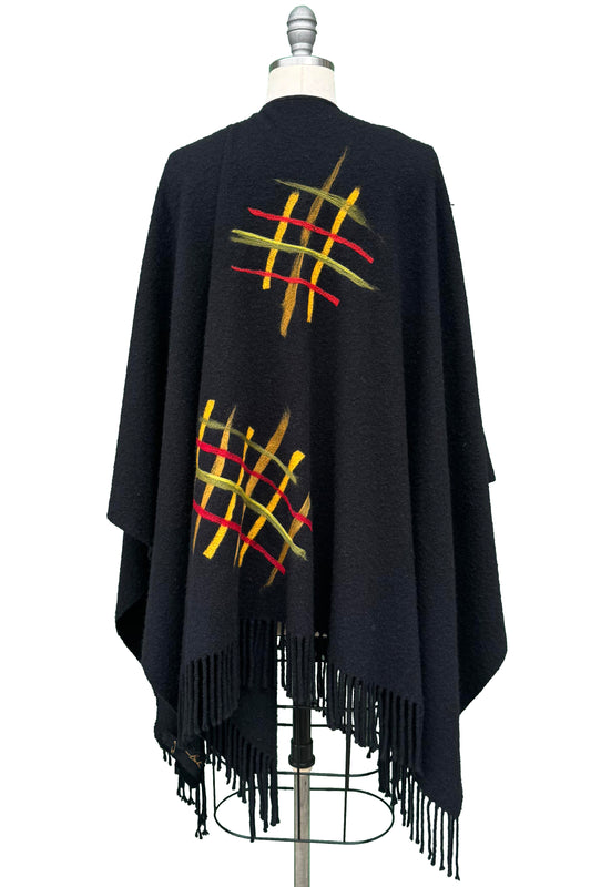 Fringed Serape Wrap | Cashmere | Needle Felted Grid | Black, Gold, Red & Green