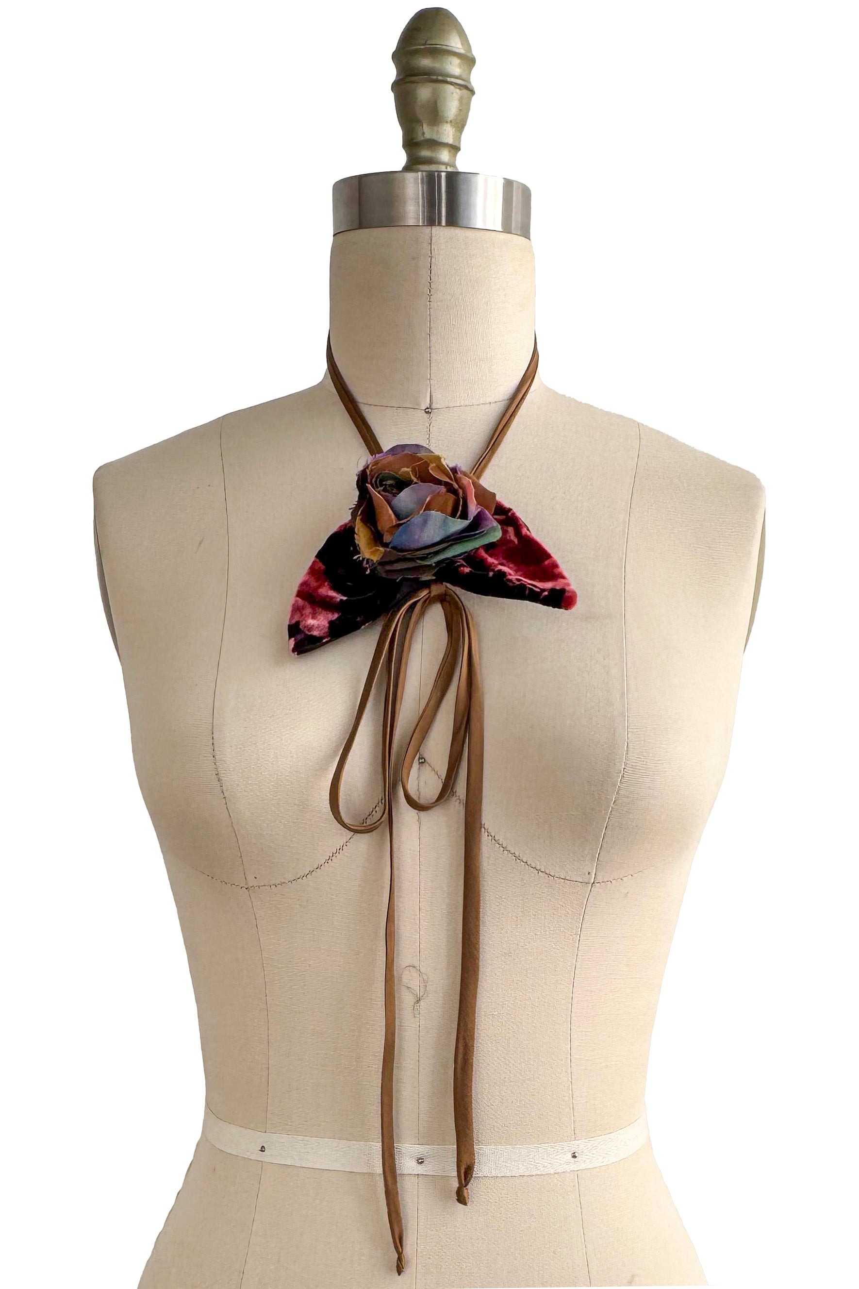 A sculptural take on the classic bolo tie, combining elegance with a touch of playfulness. Each piece features a meticulously folded fabric bloom at the center with a leather slide backing, framed by sleek, adjustable ties for versatile styling. Whether worn as a statement necklace, cinched at the waist, or draped loosely, the Adriana Bolo adds an artful, sophisticated accent to any look.