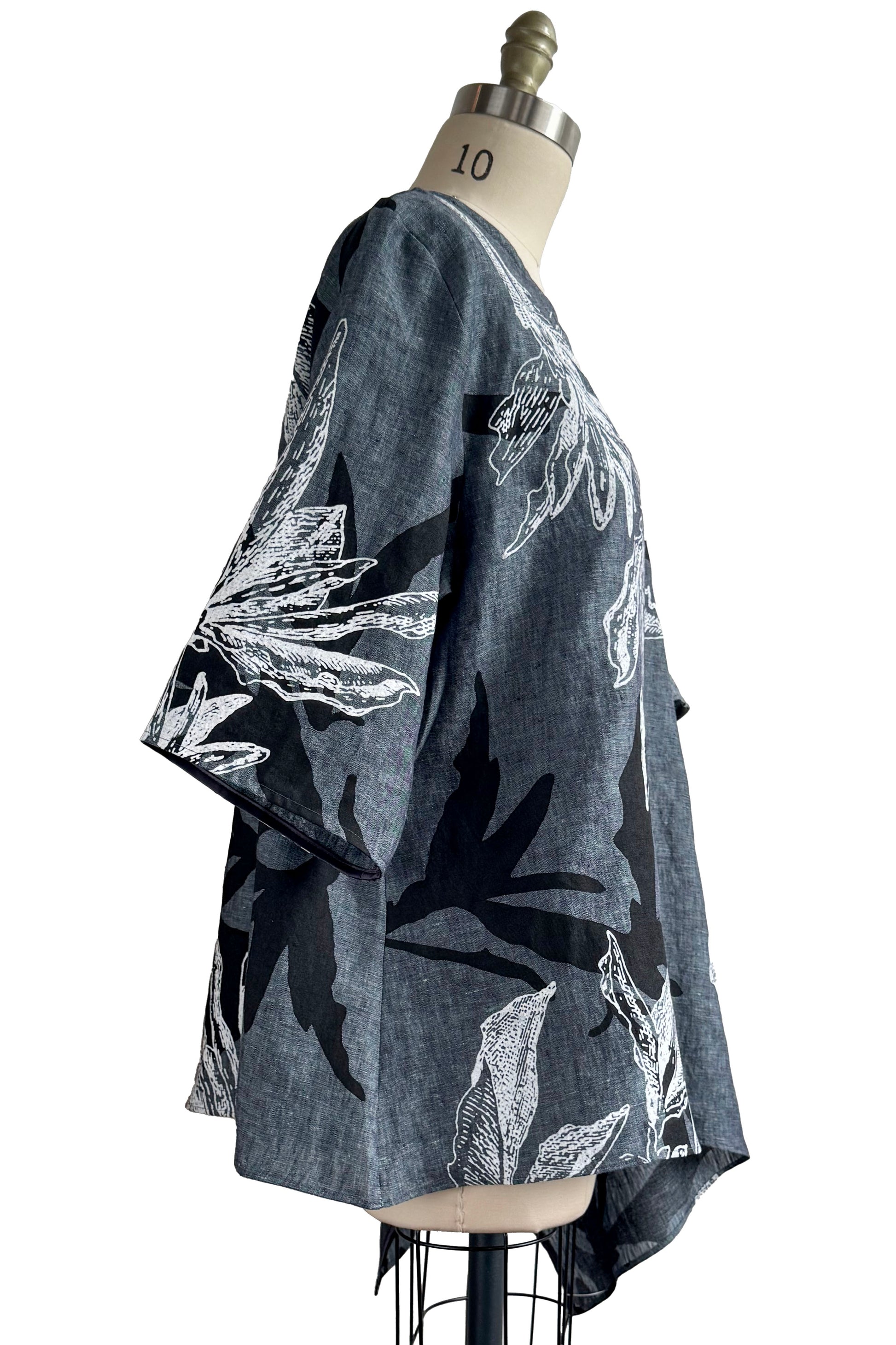 Asymmetrical Top in Linen w/ Azalea Print - Denim Blue, White & Black - Large