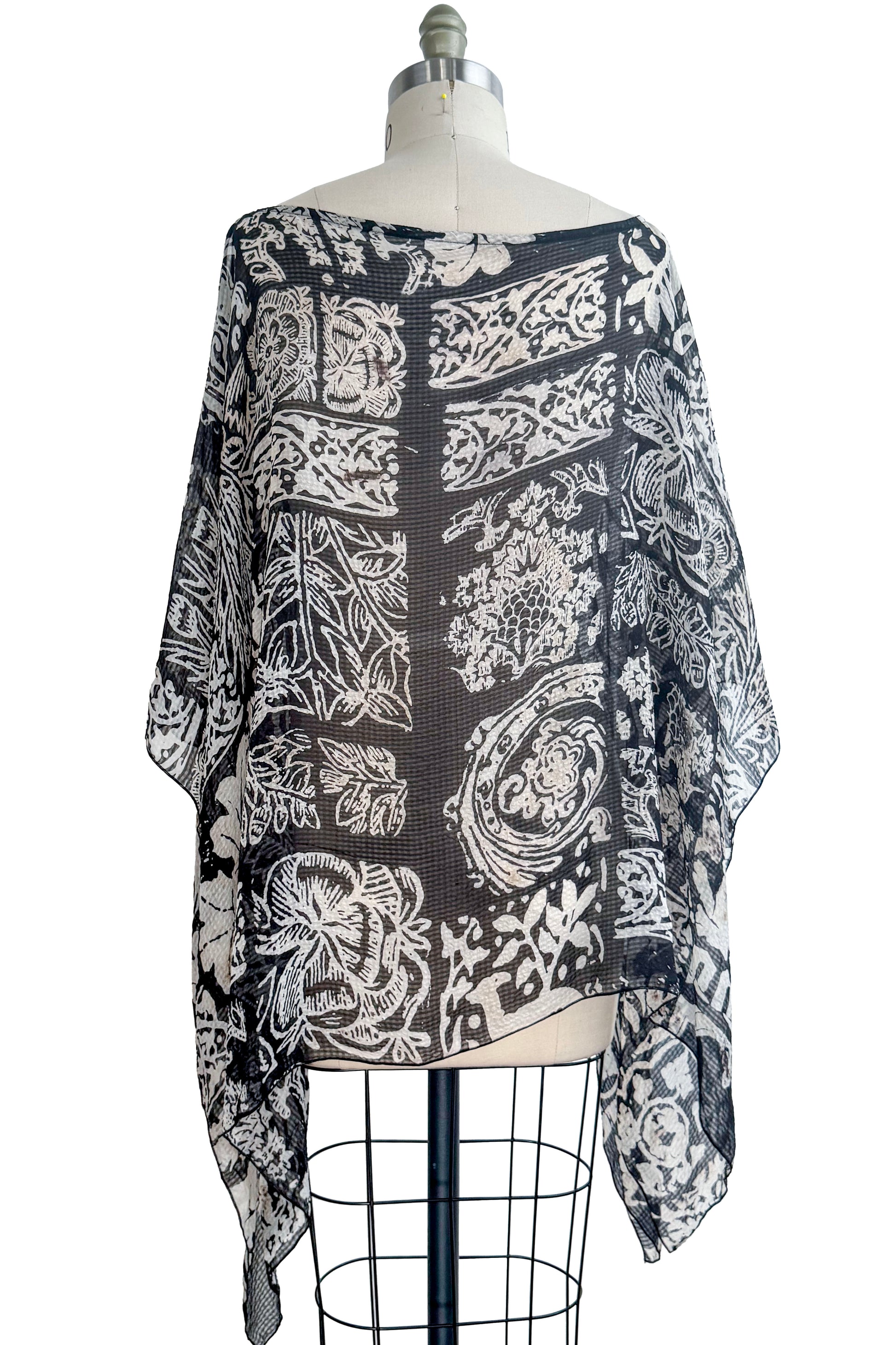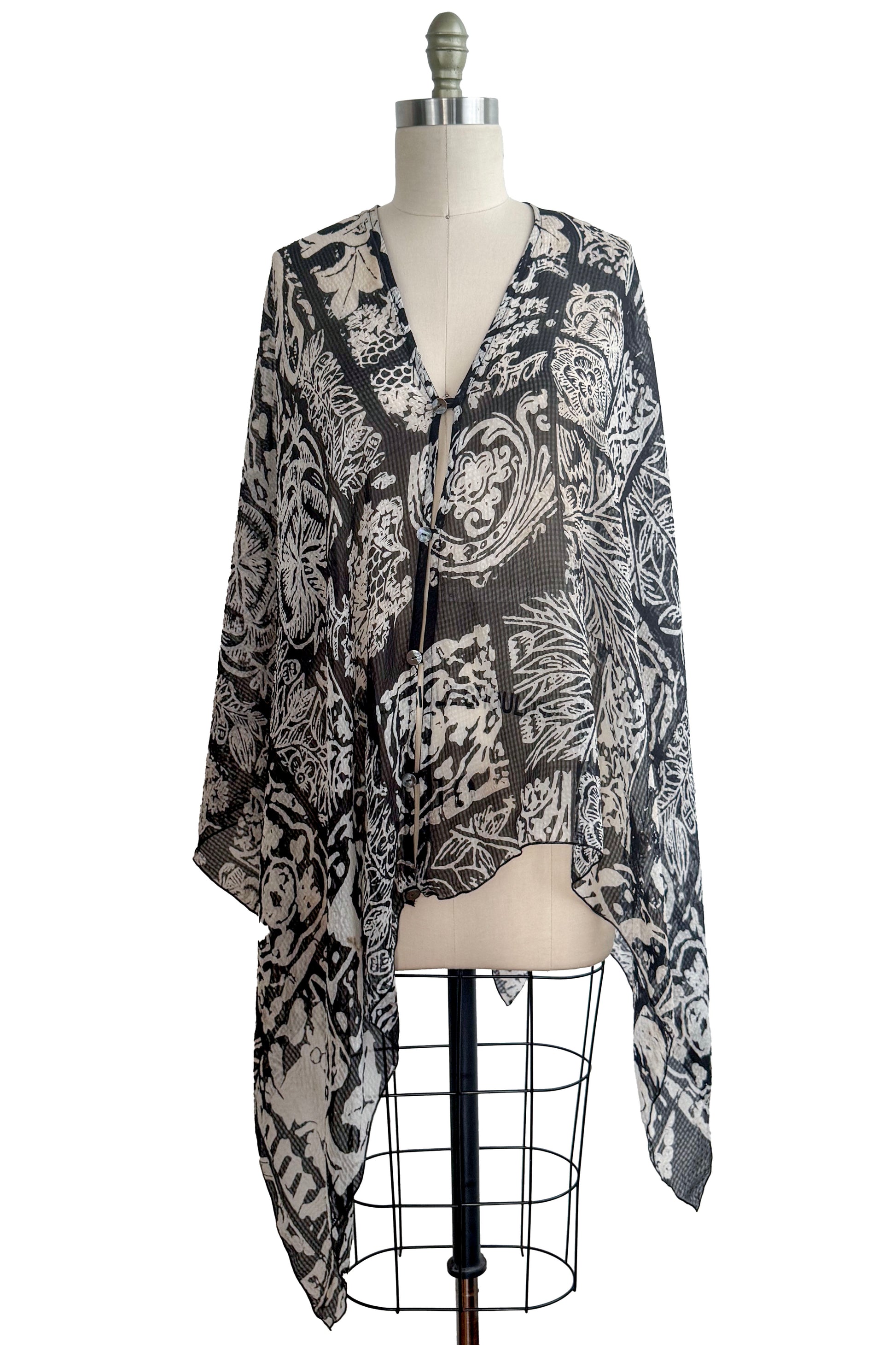 Strategically placed buttons allow you to style it multiple ways—draped asymmetrically over one shoulder, open like a cape, or buttoned down the front as a top layer. The airy silhouette flows beautifully on the body, making it easy to dress up or down.