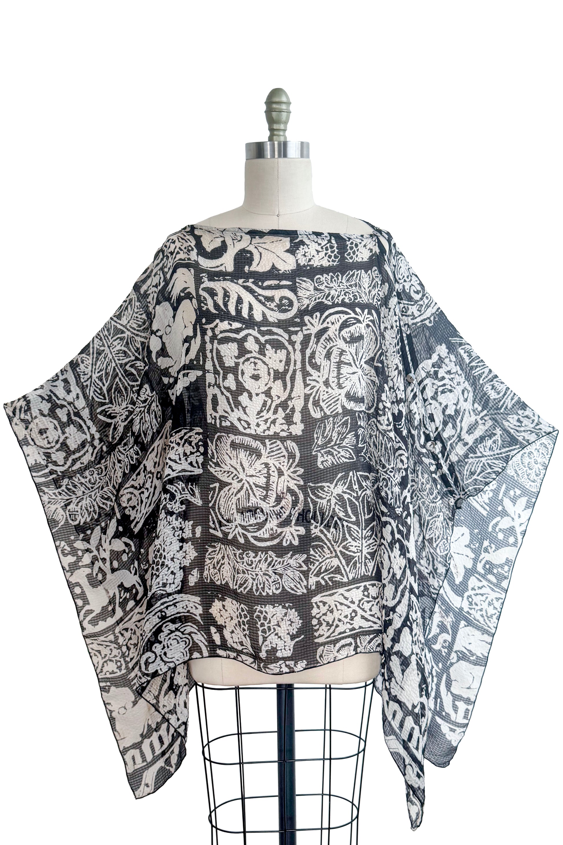 Light as air and full of movement, this poncho-style wrap is crafted from soft, textured seersucker silk and features an original hand-dyed design. The subtle puckered weave adds body and bounce, giving the garment a gentle structure without weight.