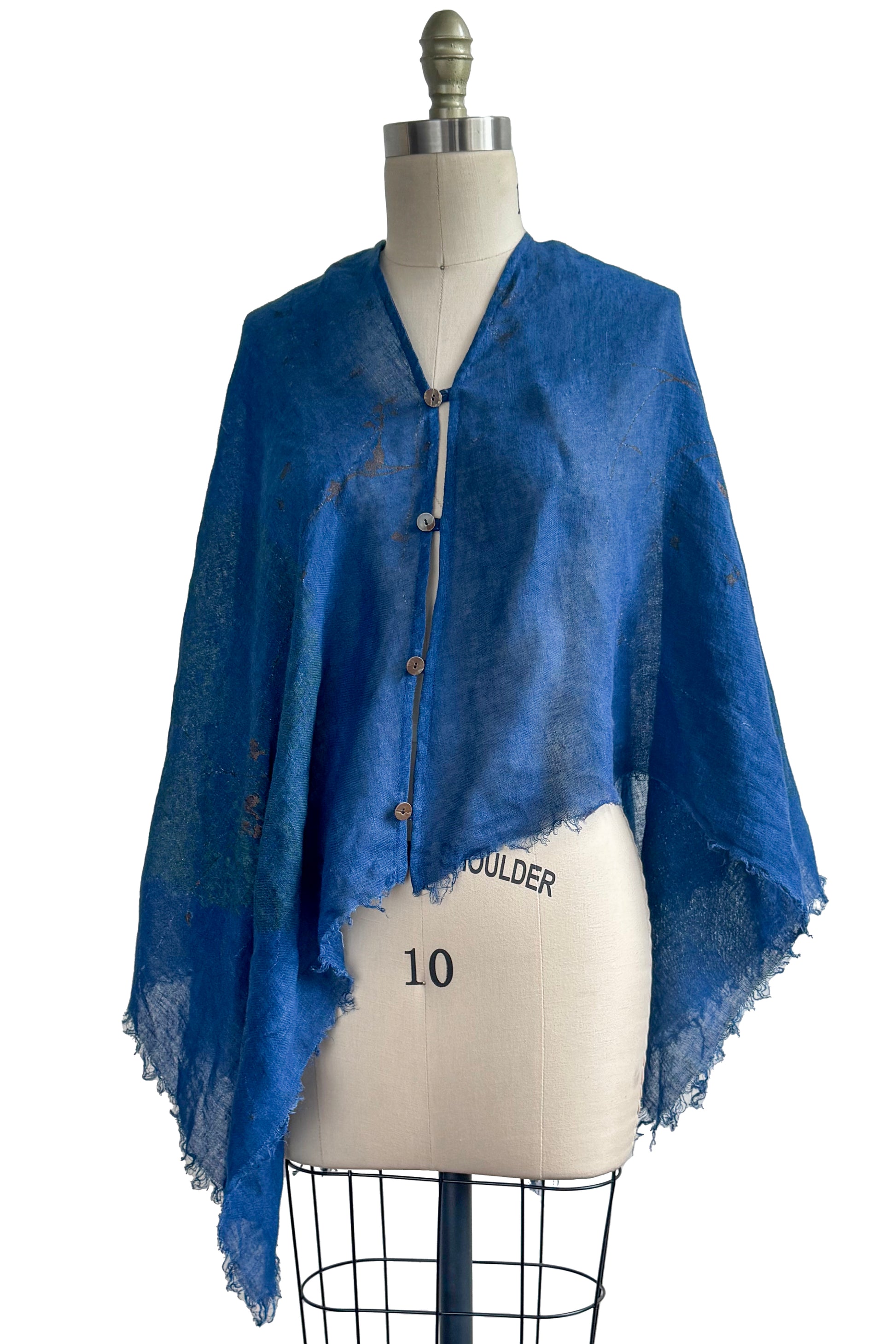 Strategically placed buttons allow you to style it multiple ways—draped asymmetrically over one shoulder, open like a cape, or buttoned down the front as a top layer. The airy silhouette flows beautifully on the body, making it easy to dress up or down.