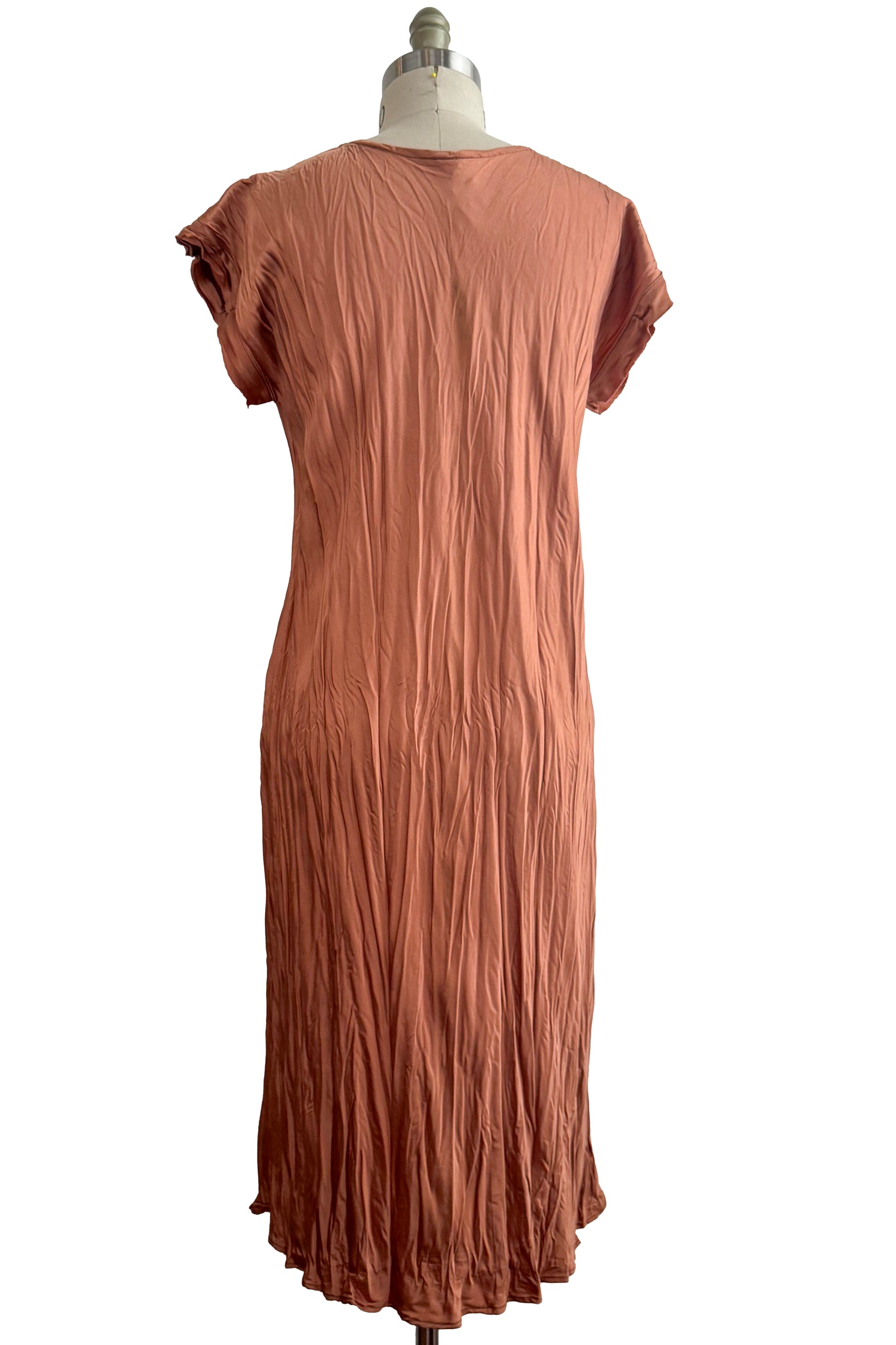 This Crinkle Dress is crafted from silk charmeuse. Its crinkled texture gives it a unique look and makes it incredibly easy to care for and pack.