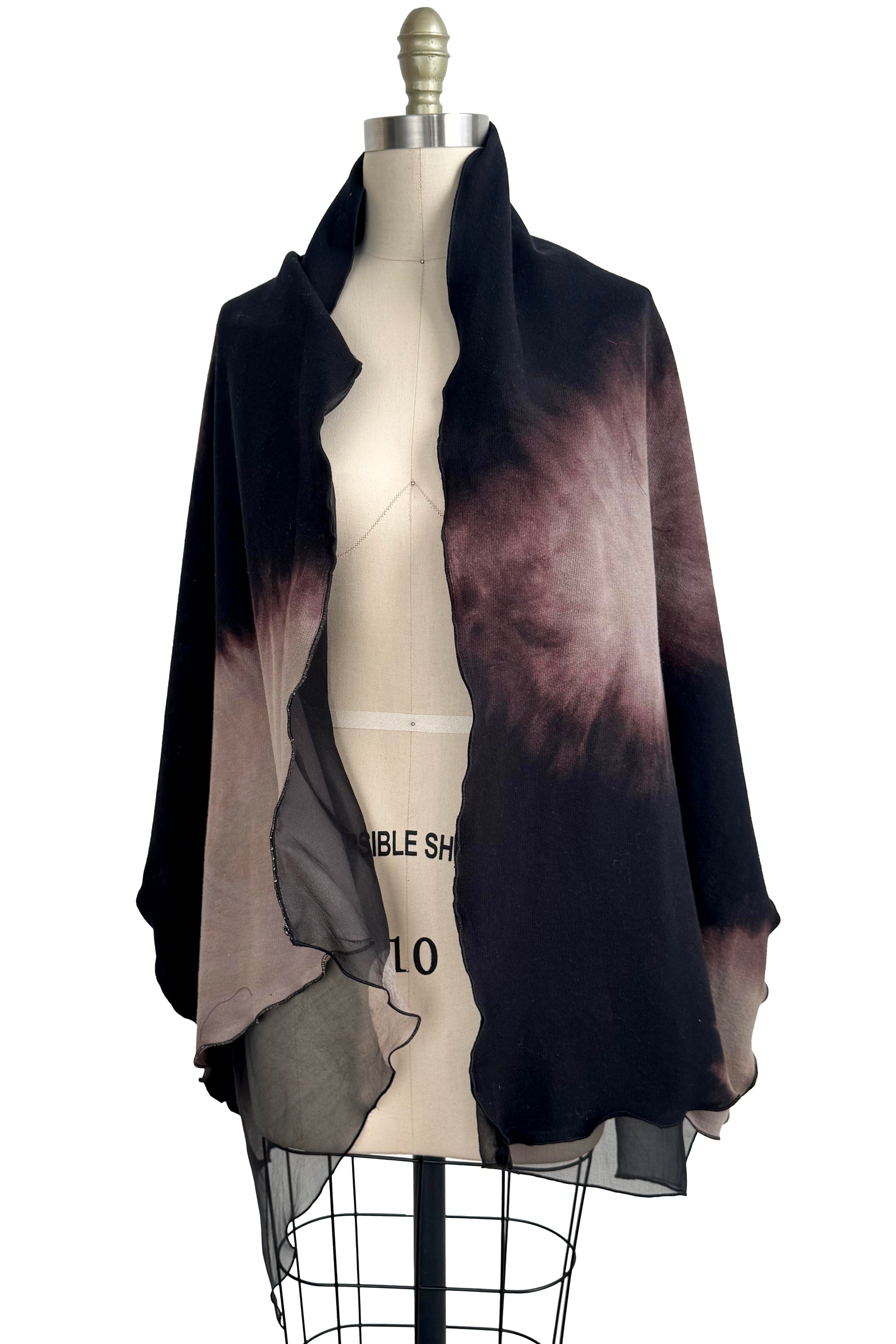 This elegant shawl features a hand‑finished double layer of sheer silk organza and soft organic cotton French terry, handcrafted in our studio. Each one is uniquely hand‑dyed or printed, ensuring no two are alike. With a generous drape and refined silhouette, it transitions effortlessly from day to evening and offers lightweight layering for year‑round versatility.