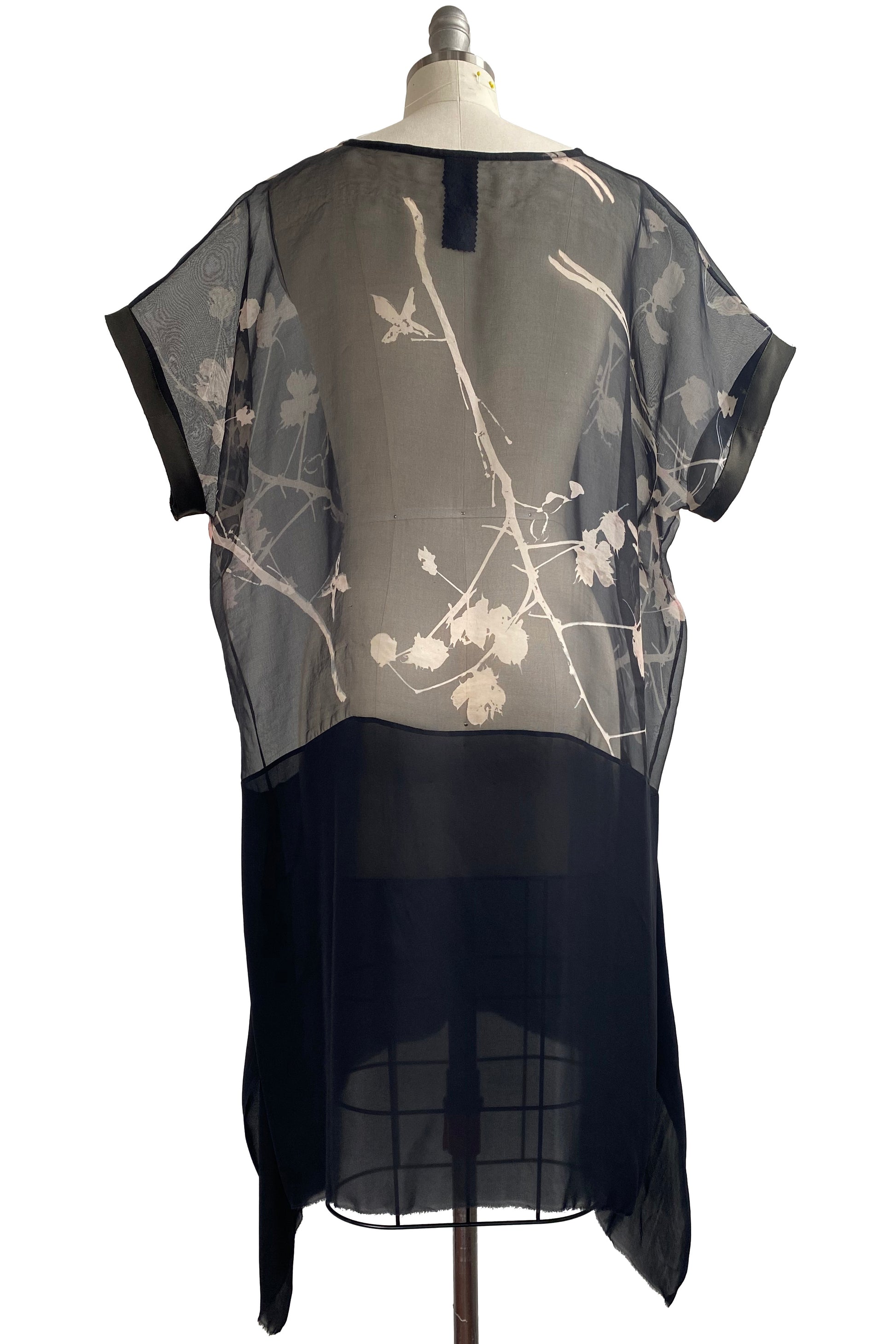 The Essa Dress features a flowing, asymmetrical silhouette with a mix of lightweight silk panels and bold, custom-printed designs. Its drop shoulder sleeves and relaxed fit create an elegant, effortless shape that transitions easily from day to evening.