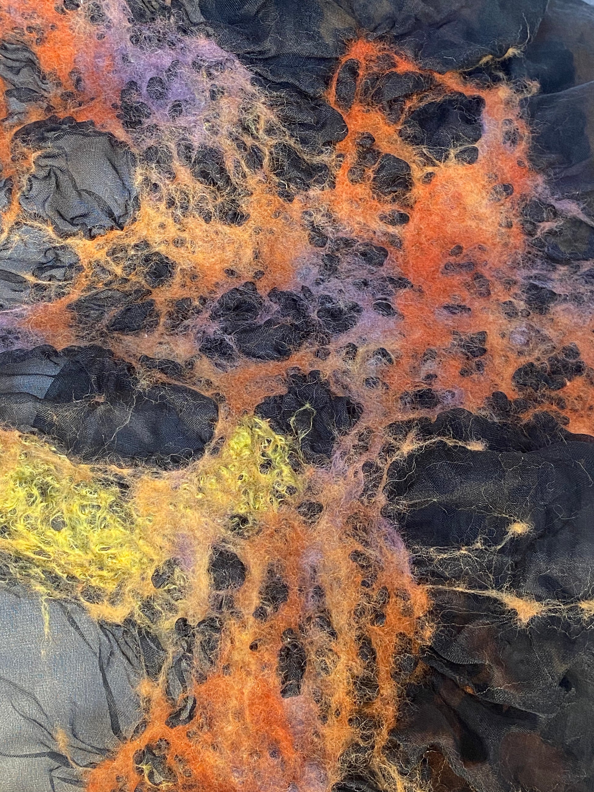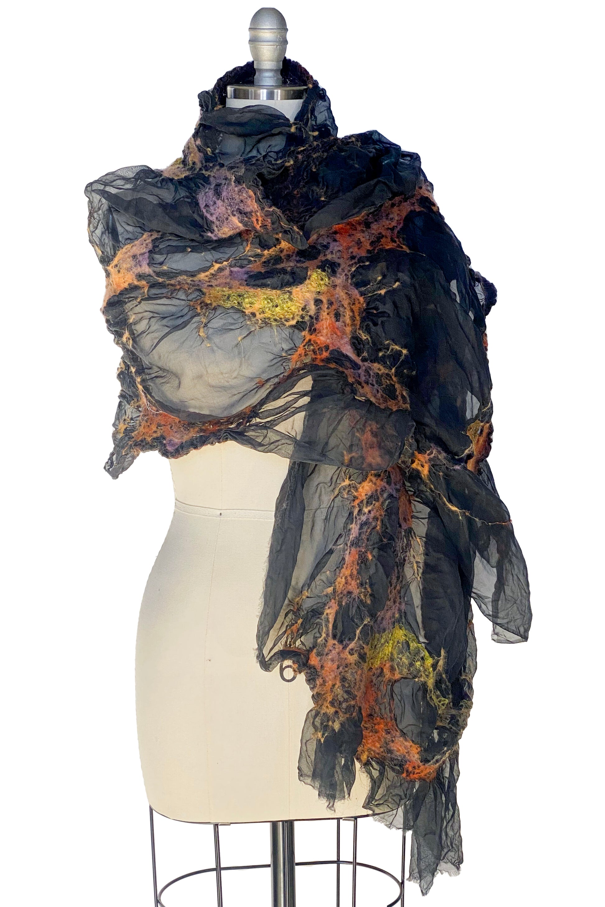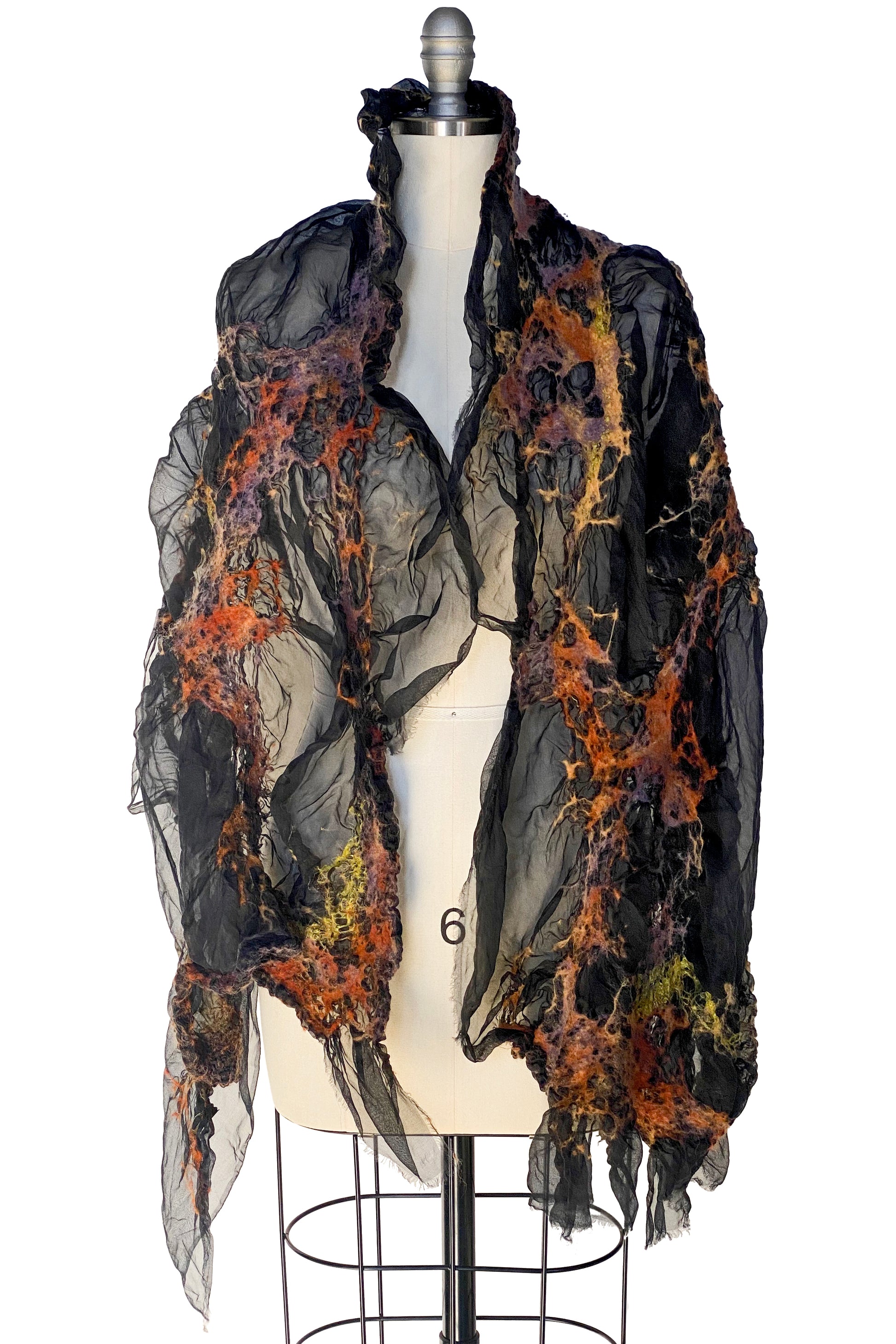 The result is a piece that feels both delicate and earthy—light as air, yet full of depth and dimension. Wisps of curly wool and vibrant color peek through the translucent silk, forming a painterly effect that shifts with every drape and fold. Each shawl is completely one of a kind, shaped by the unpredictable, expressive nature of the felting process.