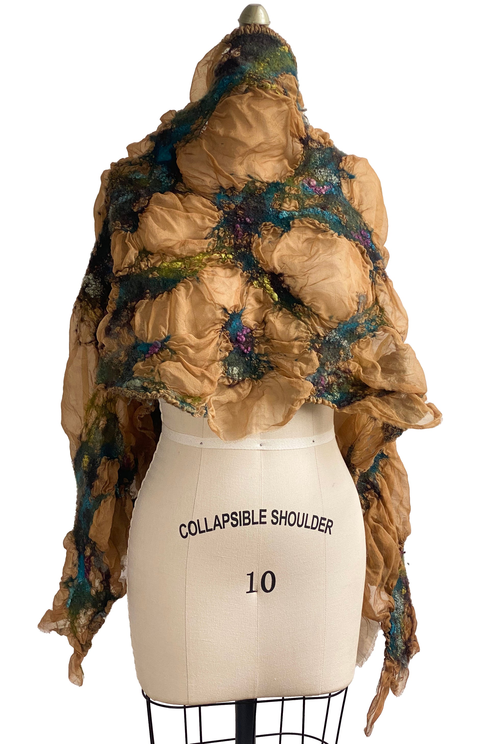This ethereal shawl is crafted from lightweight silk organza, with richly textured panels of hand-felted wool integrated directly into the fabric. Using a technique called nuno felting, soft wool fibers are carefully layered and fused into sheer silk by hand, creating an organic, sculptural texture that ripples with movement.