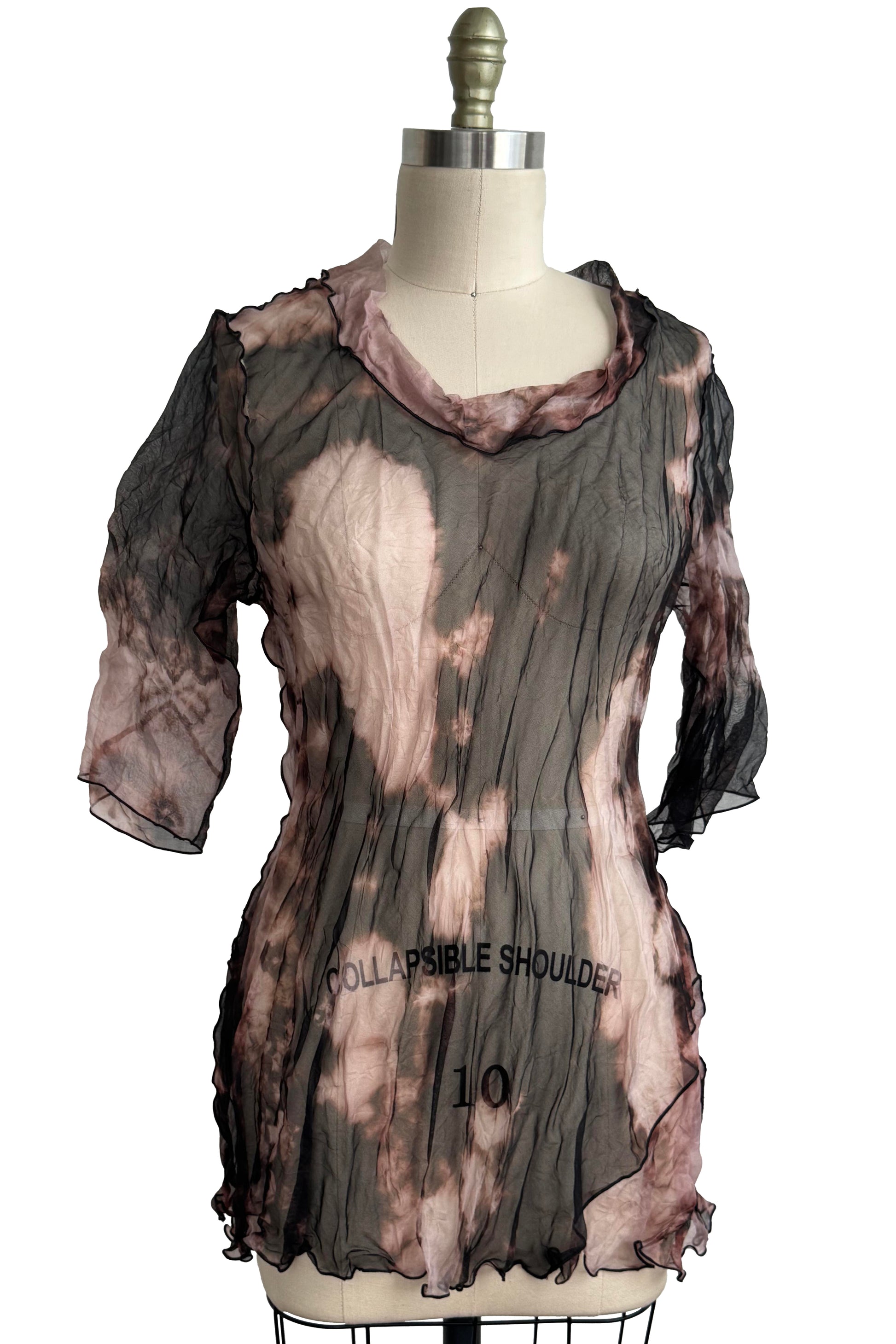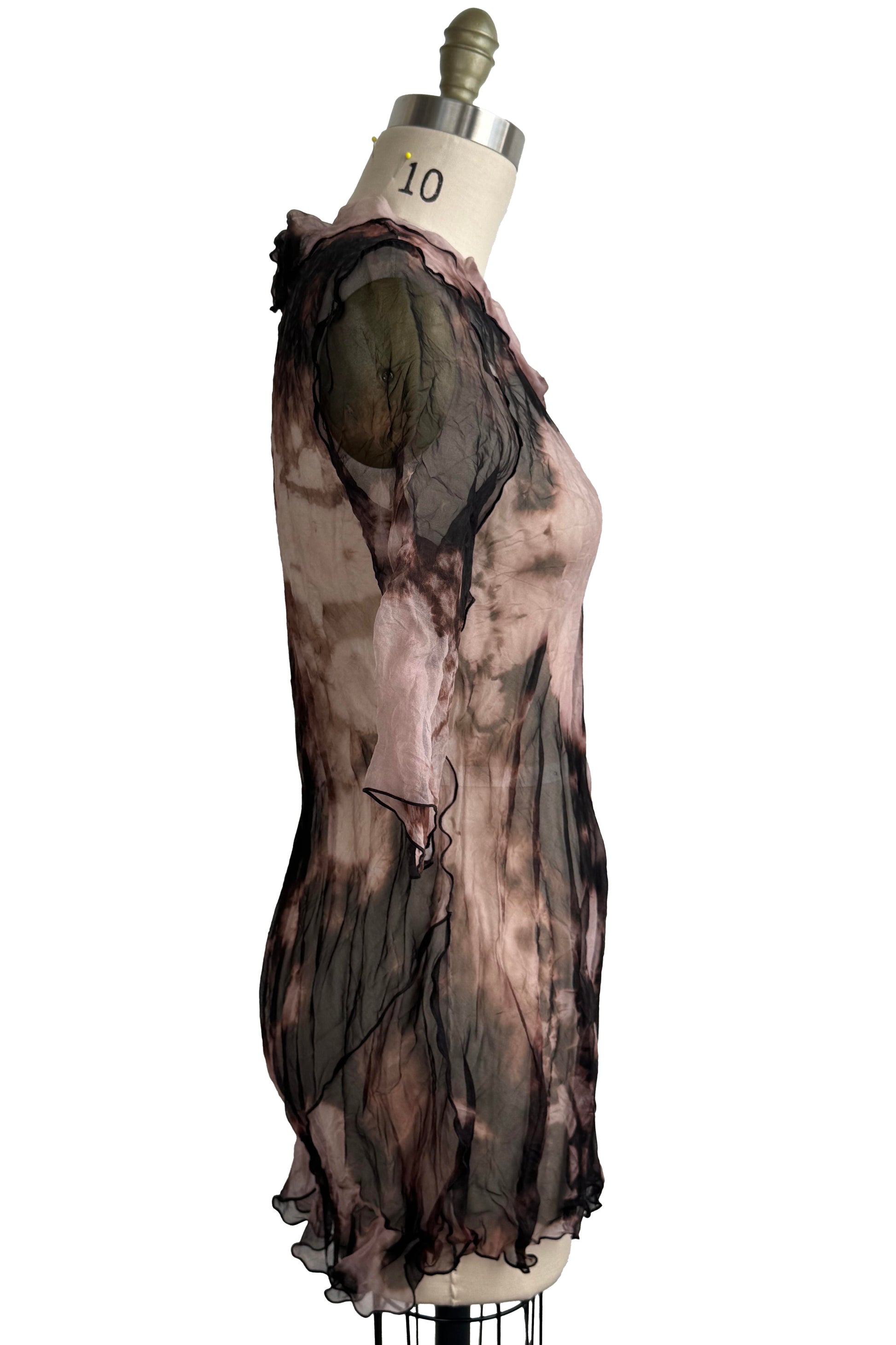 This sheer tunic dress is crafted from lightweight silk organza, offering an airy, ethereal drape. The fabric is hand-dyed and printed with intricate organic patterns in soft black and green using screen-printing techniques for textural effect.