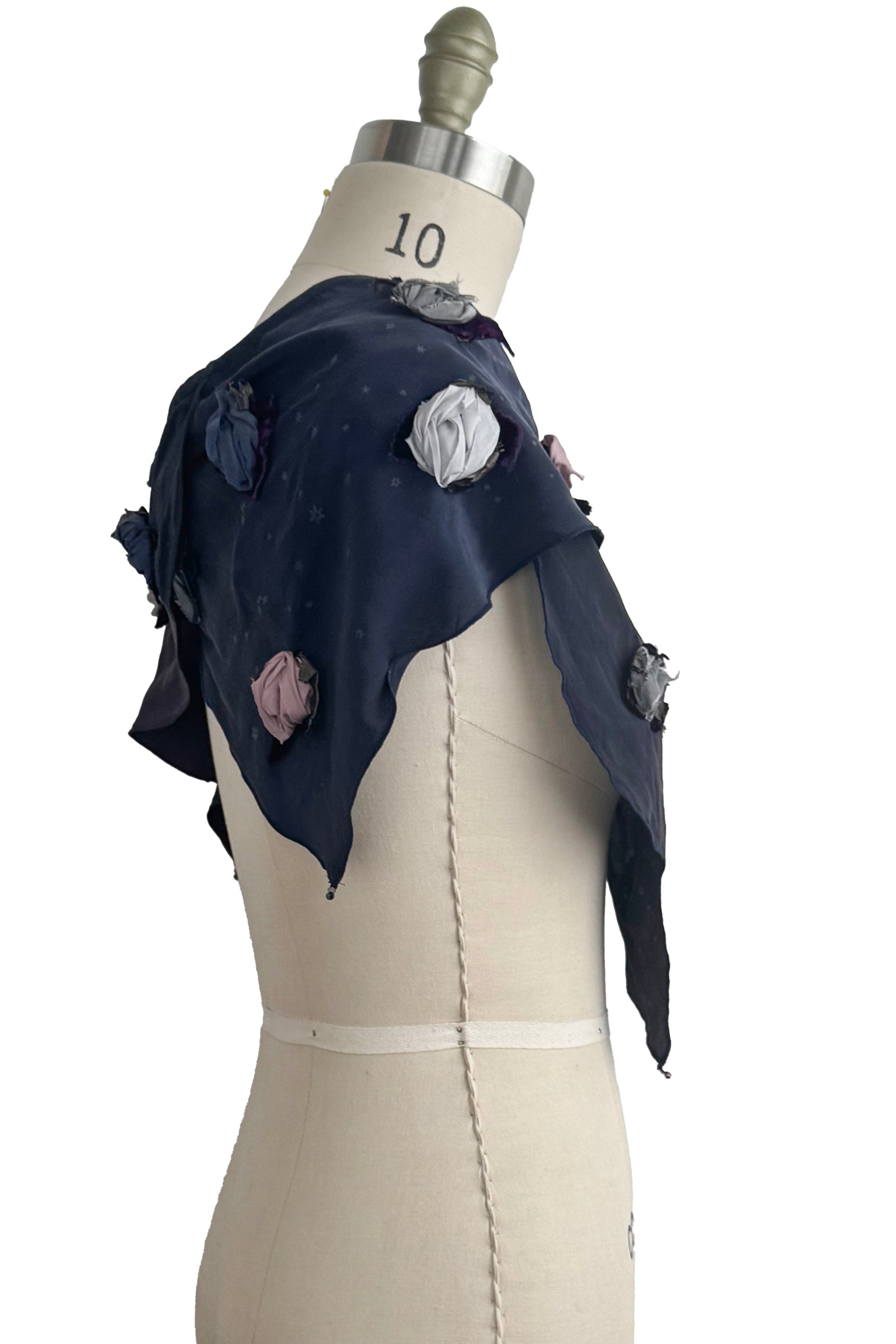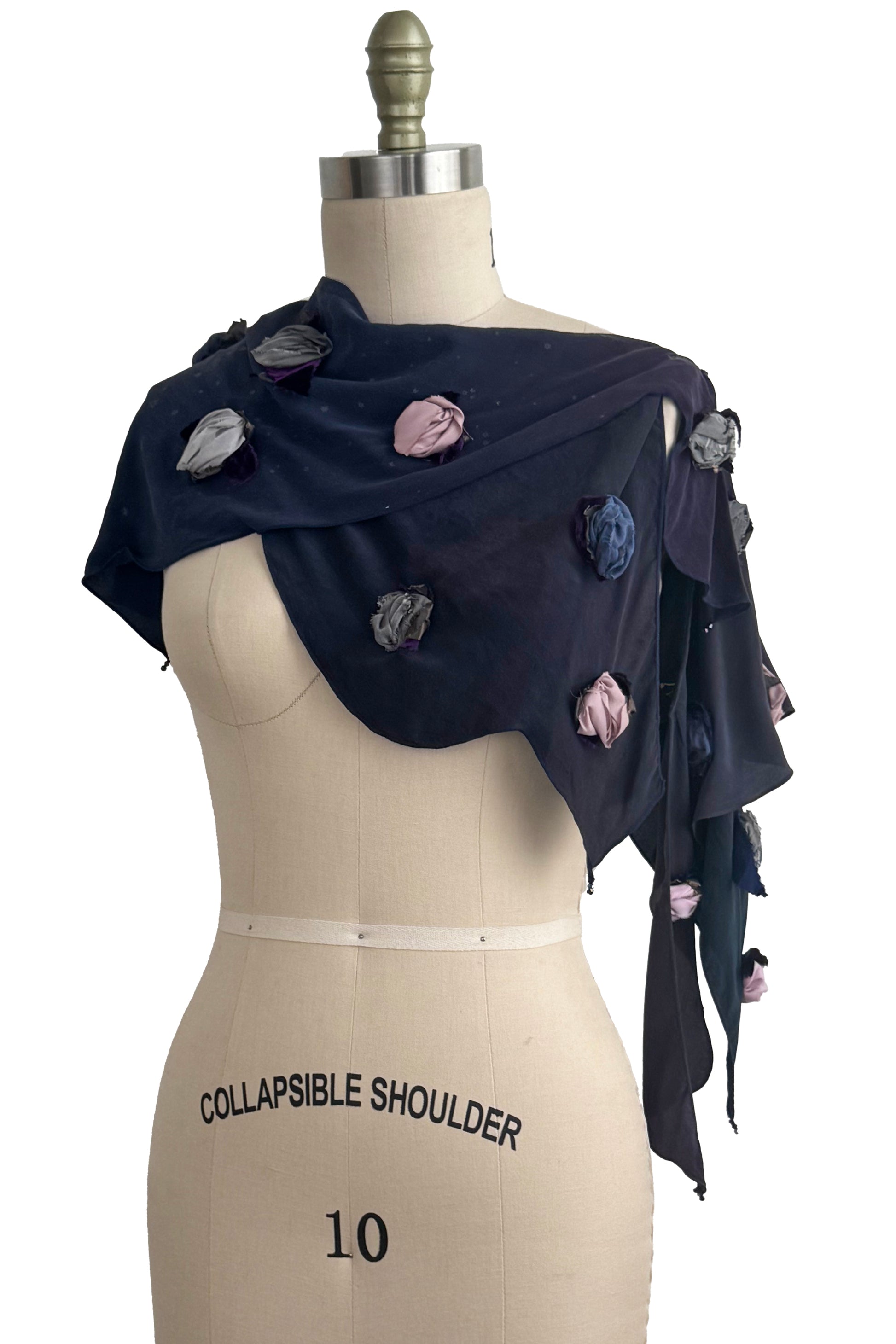 Crepe de Chine Krazy Scarf - Silk Rosettes & Beads - Midnight, Lavender & Grey
