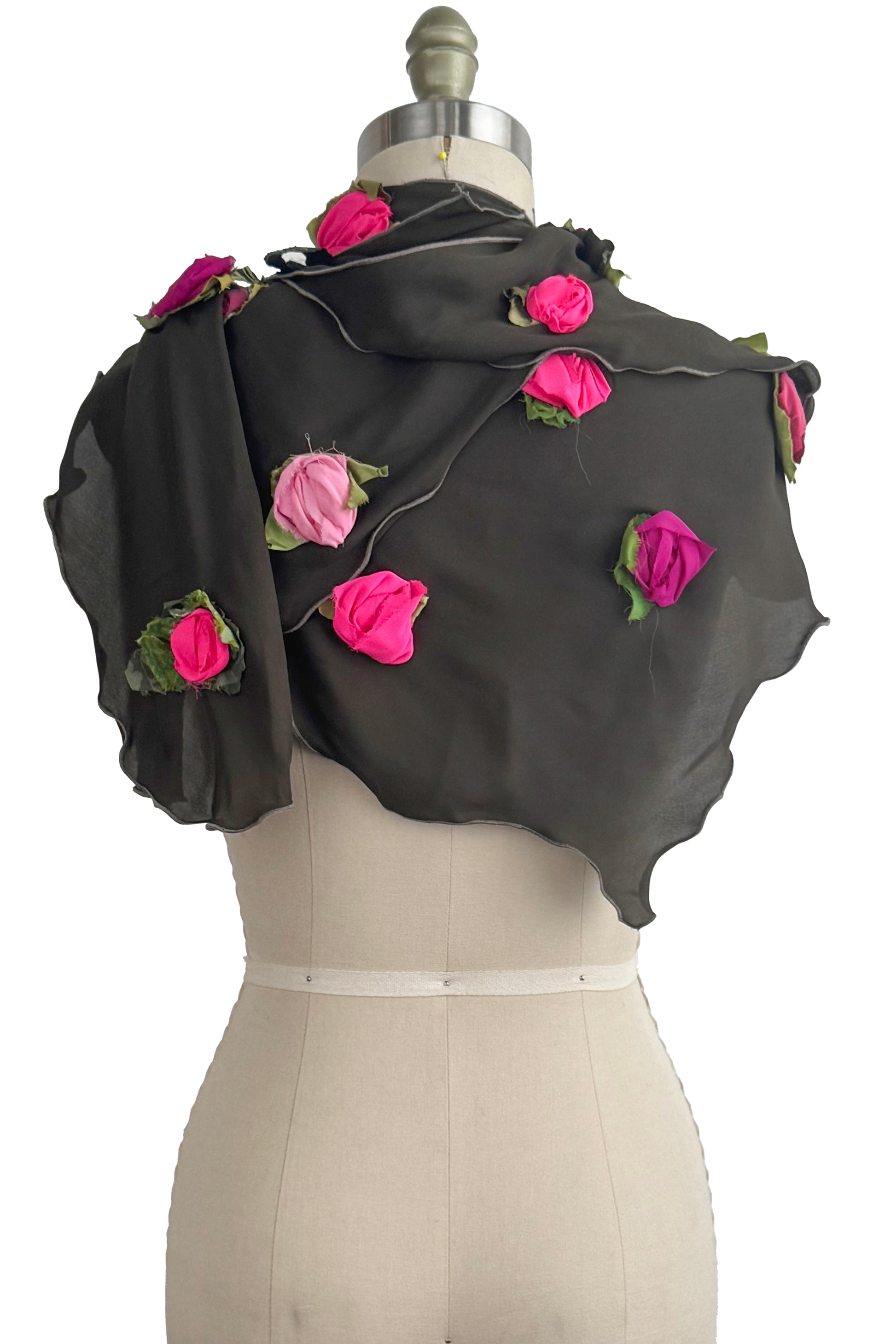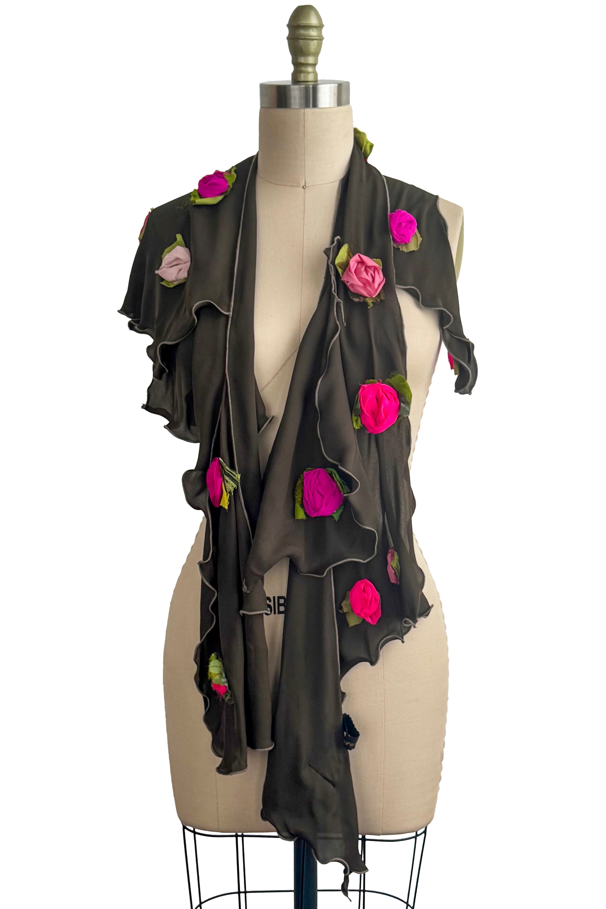 Georgette Krazy Scarf - Silk Rosettes - Olive & Pink