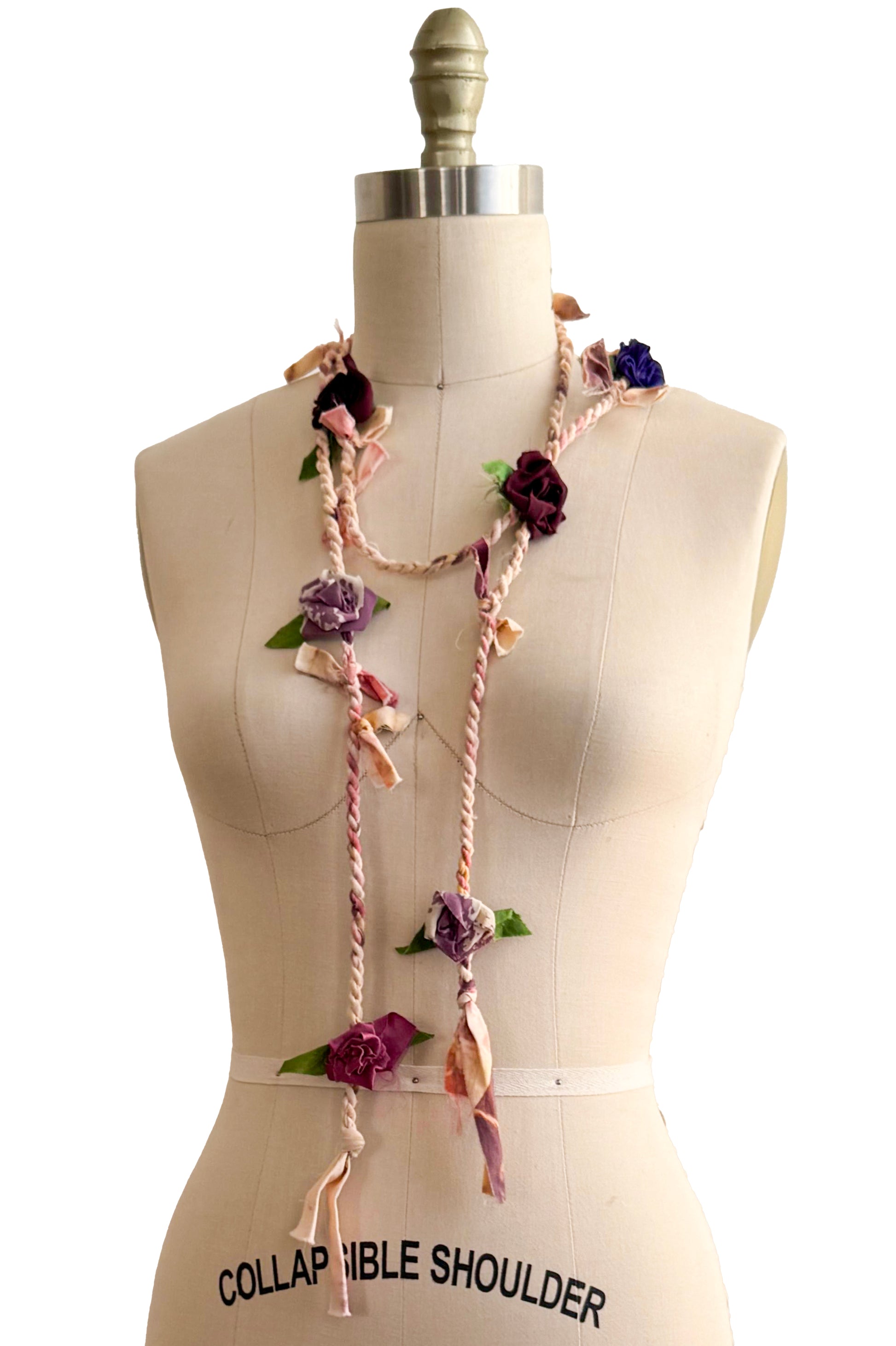 These delicate, versatile lariats are made from braided silk and cotton rope, finished with hand-formed rosettes crafted from reclaimed silk scraps left over from our garment production. Light and flexible, they can be worn as a necklace, wrapped as a scarf, or tied around the wrist, waist, or hair for a bit of playful color.