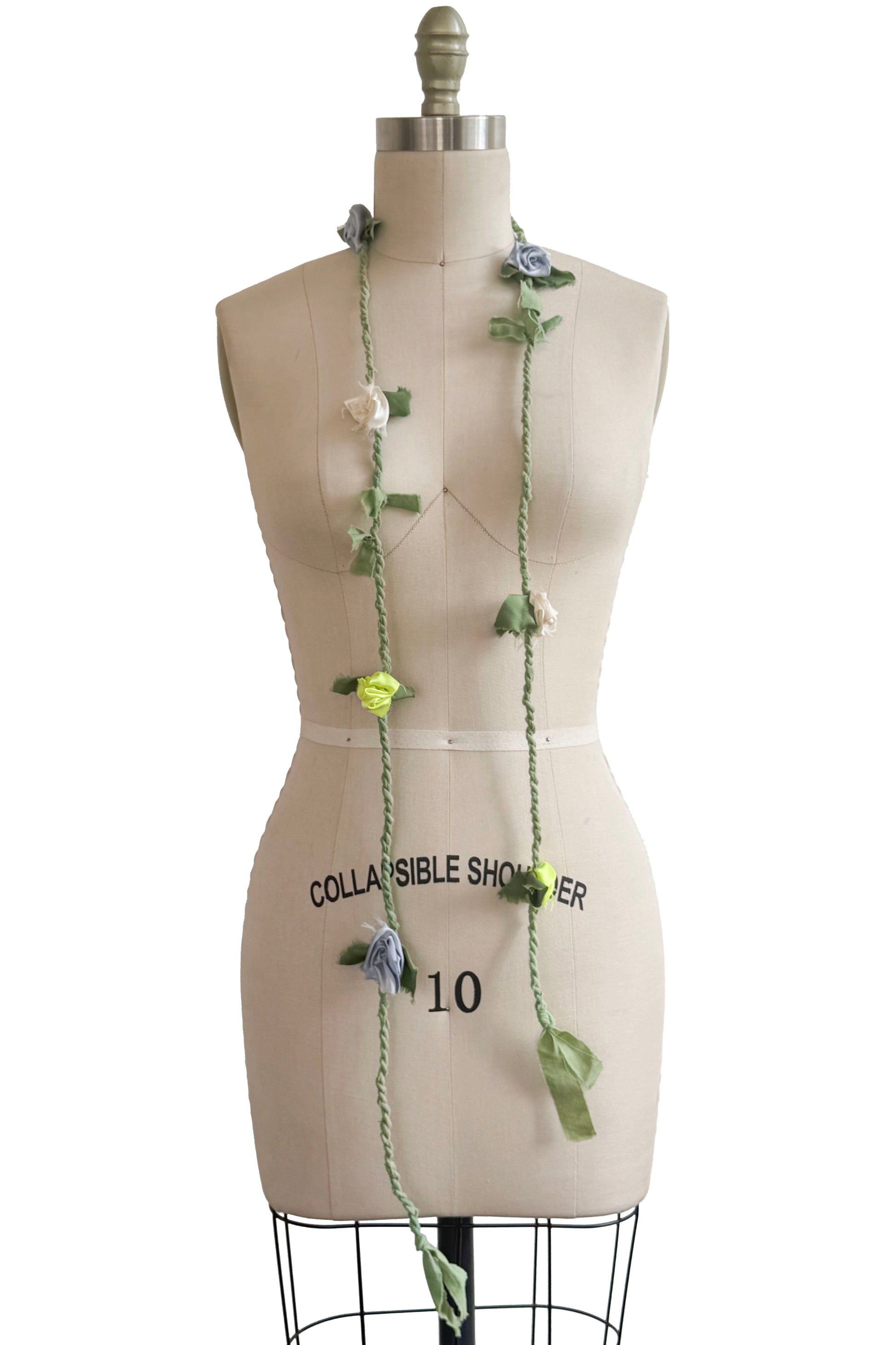 These delicate, versatile lariats are made from braided silk and cotton rope, finished with hand-formed rosettes crafted from reclaimed silk scraps left over from our garment production. Light and flexible, they can be worn as a necklace, wrapped as a scarf, or tied around the wrist, waist, or hair for a bit of playful color.