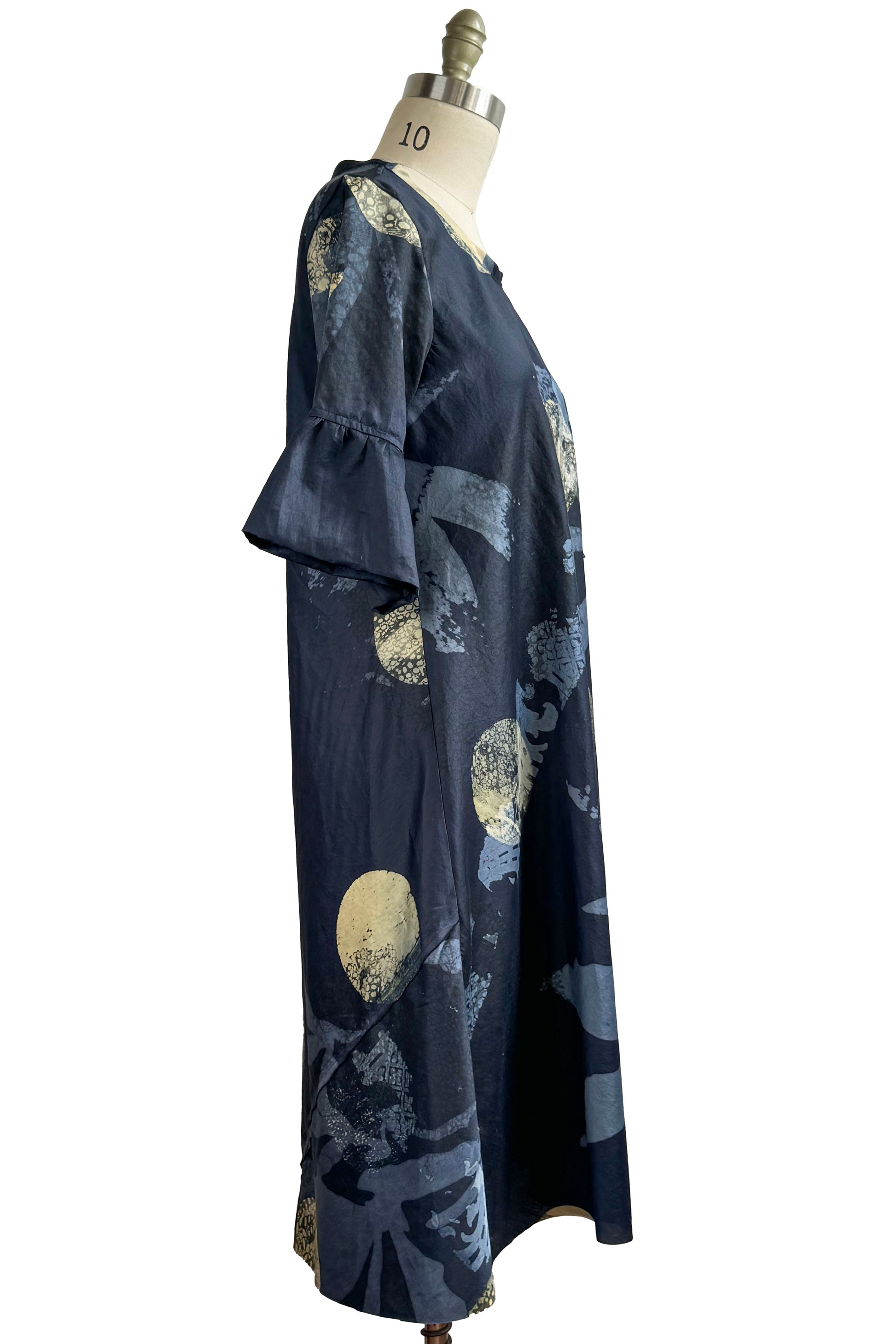 Jazzy Fest Dress in Silk Linen w/ Azalea & Moon Print - Indigo & Natural - Small