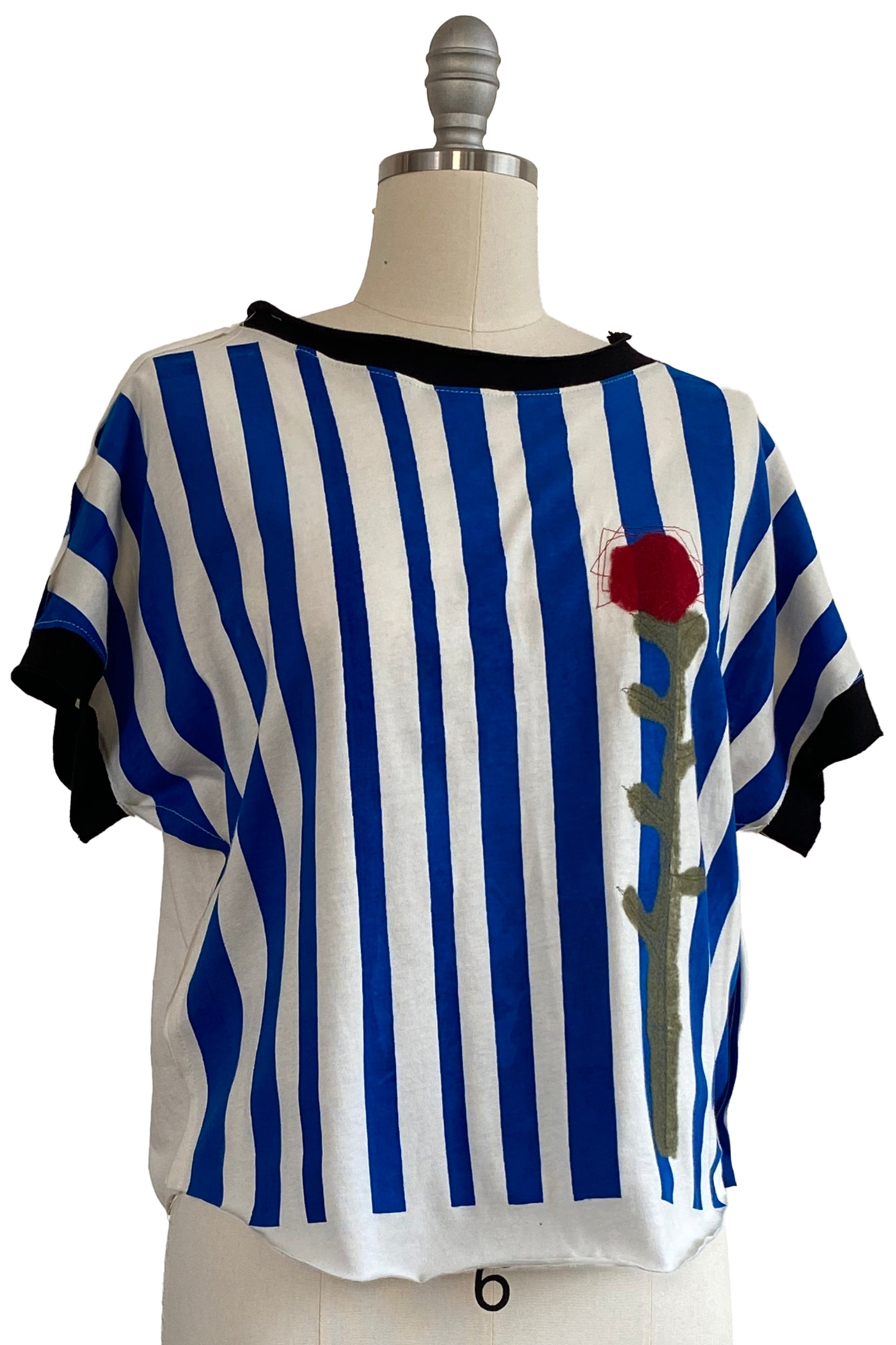 Jen Top | Organic Cotton Jersey | Painted Stripe & Felted Flower | White, Blue & Black | Small