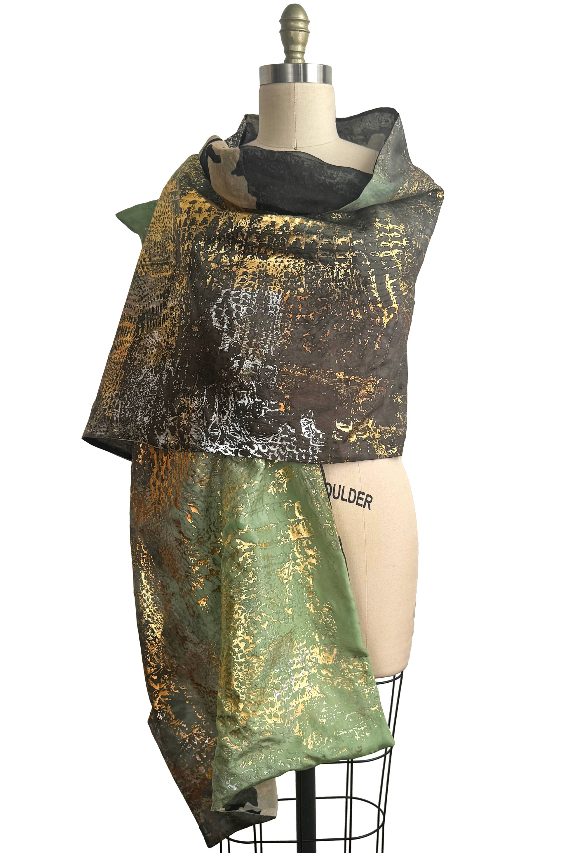 A statement piece that blends edgy glamour with delicate craftsmanship, this shawl features sheer silk organza layered over china silk, hand-printed with a glimmering alligator-inspired foil motif. Lightweight yet dimensional, it drapes fluidly around the shoulders or neck, elevating both casual and formal looks. Available in richly nuanced palettes, each wrap is a bold, one-of-a-kind accessory.
