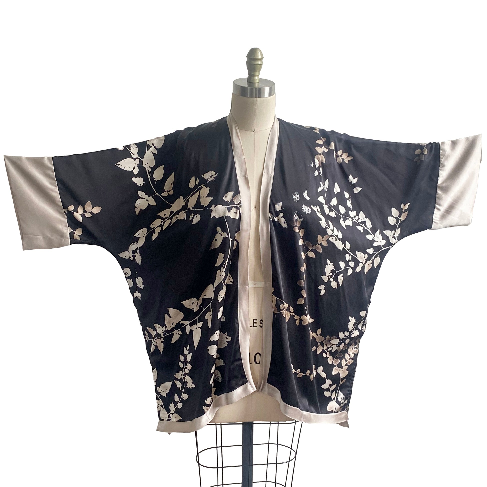 Lucianne Kimono in Silk Charmeuse w/ Vine Print - Black & Natural