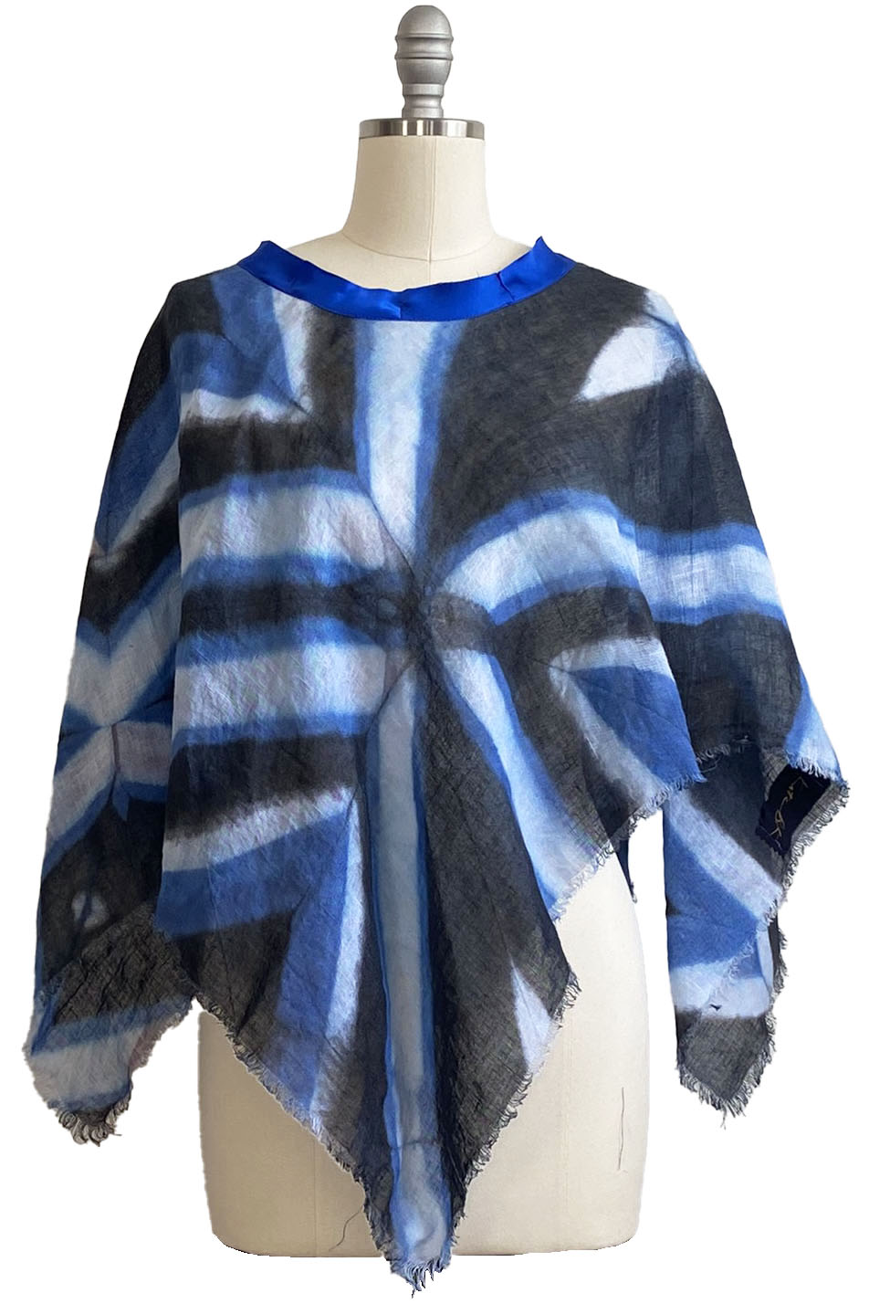 Open Weave Linen Poncho w/ Shibori Itajime Dye - Blue, White & Black