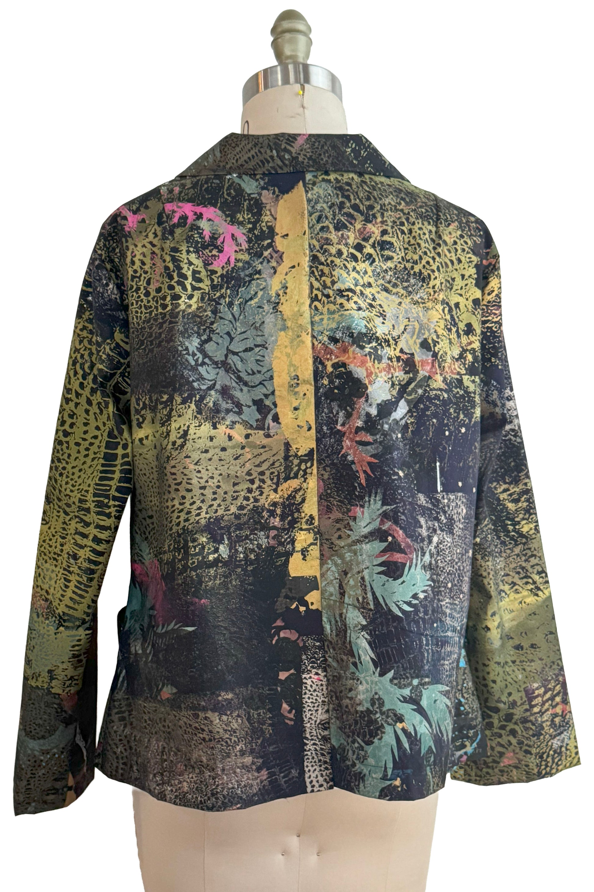This structured cotton jacket features a hand-printed botanical design, created using a multi-layered screen-printing technique. The intricate floral and leaf motifs in earthy ochres, deep blues, and soft pinks contrast beautifully against the black fabric, giving it a rich, dimensional look.