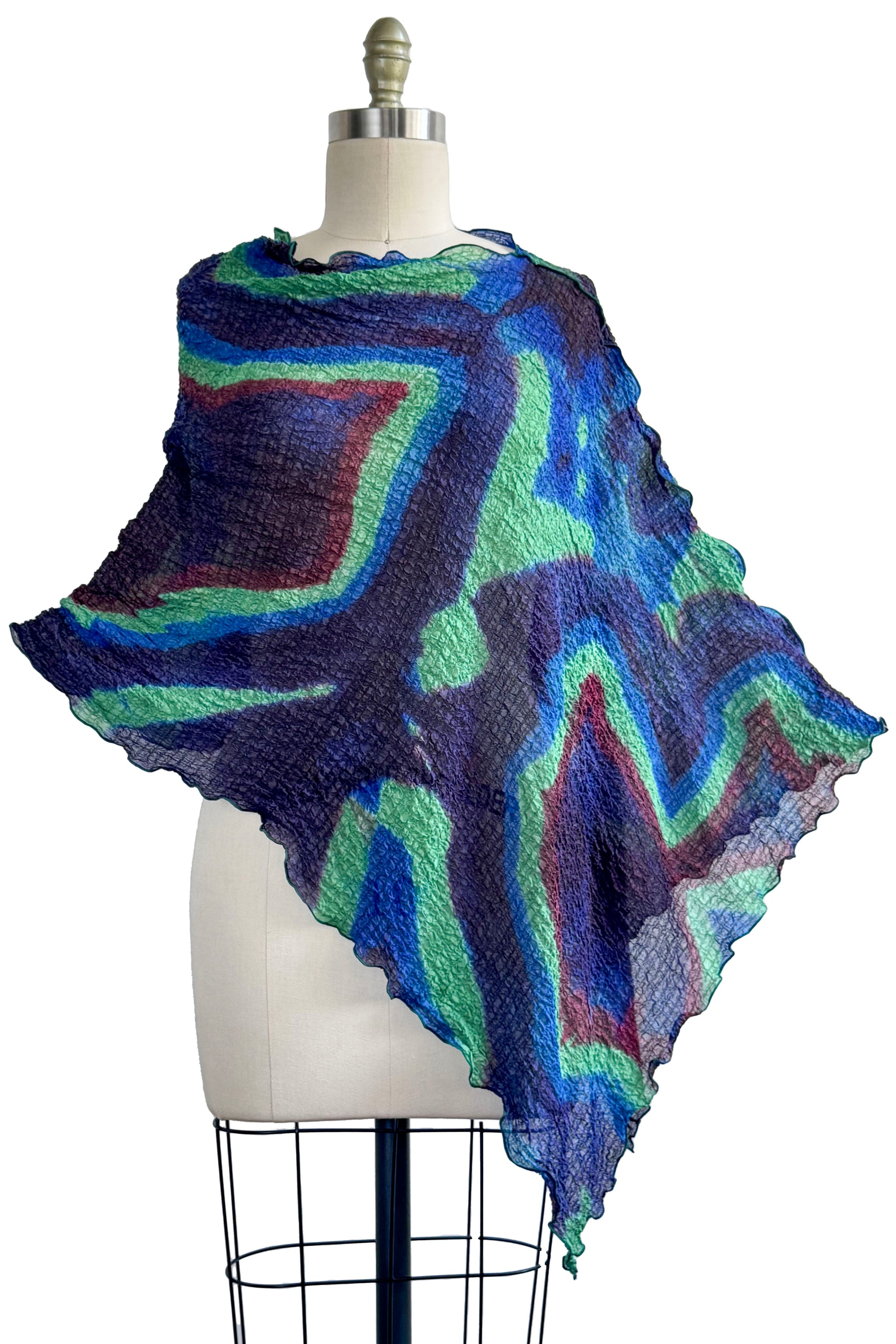 This asymmetrical poncho is crafted from lightweight textured silk, giving it a subtly crinkled texture and an airy, fluid drape. The hand-printed design in bold green contrasts beautifully creating depth and movement. A silk binding at the neckline adds a polished finish, while the flowing silhouette allows for versatile styling.