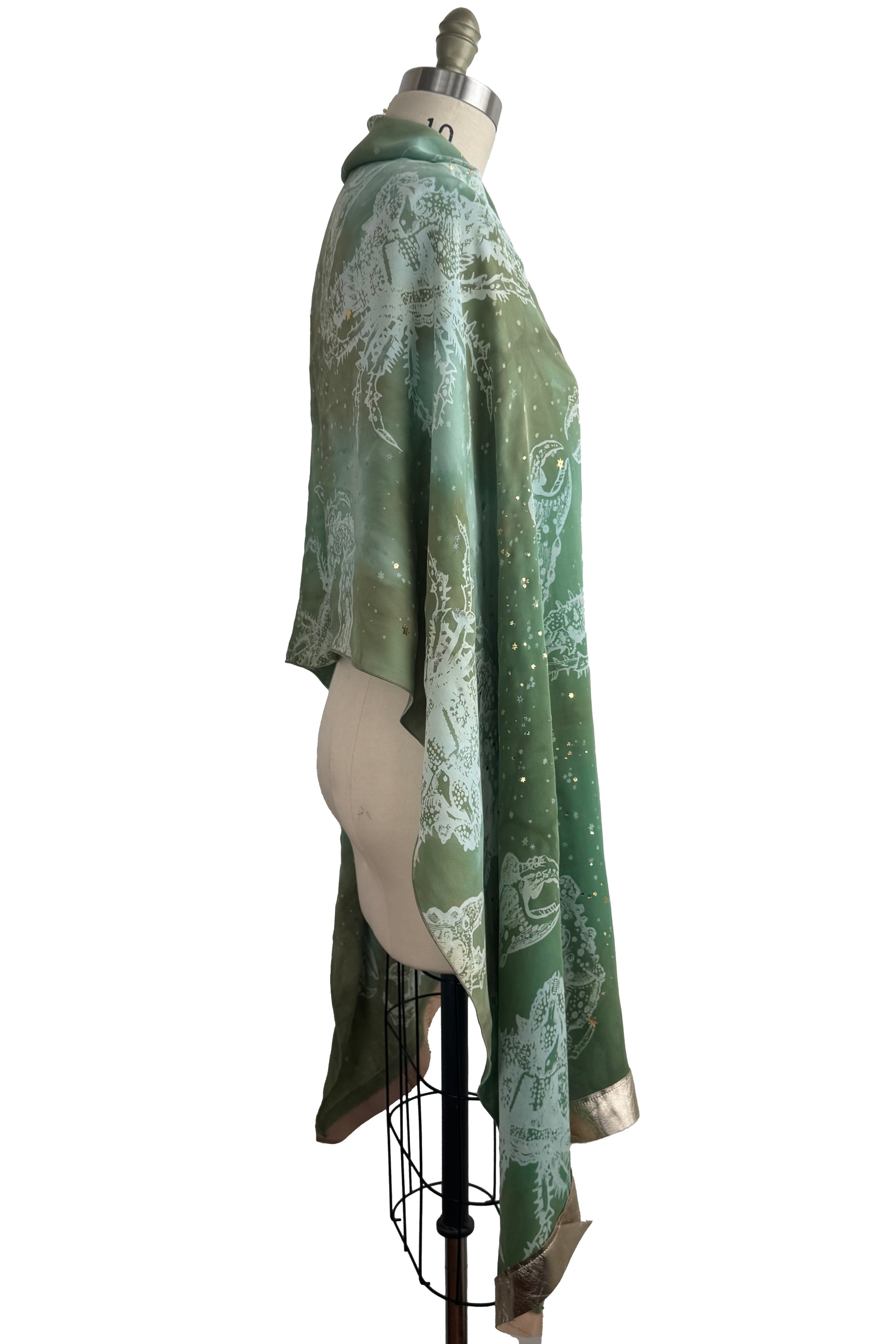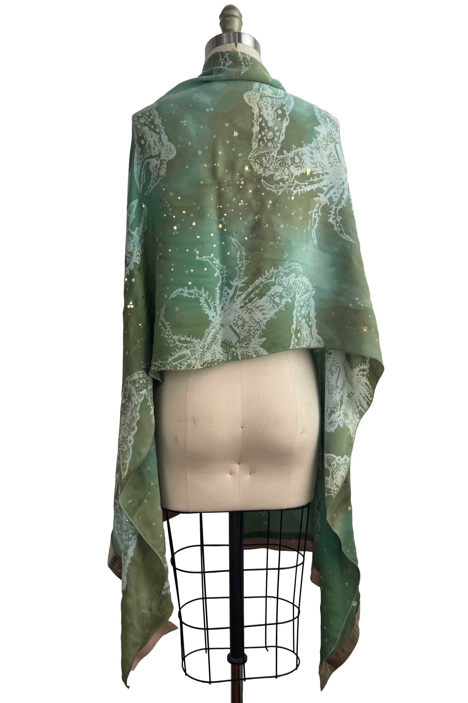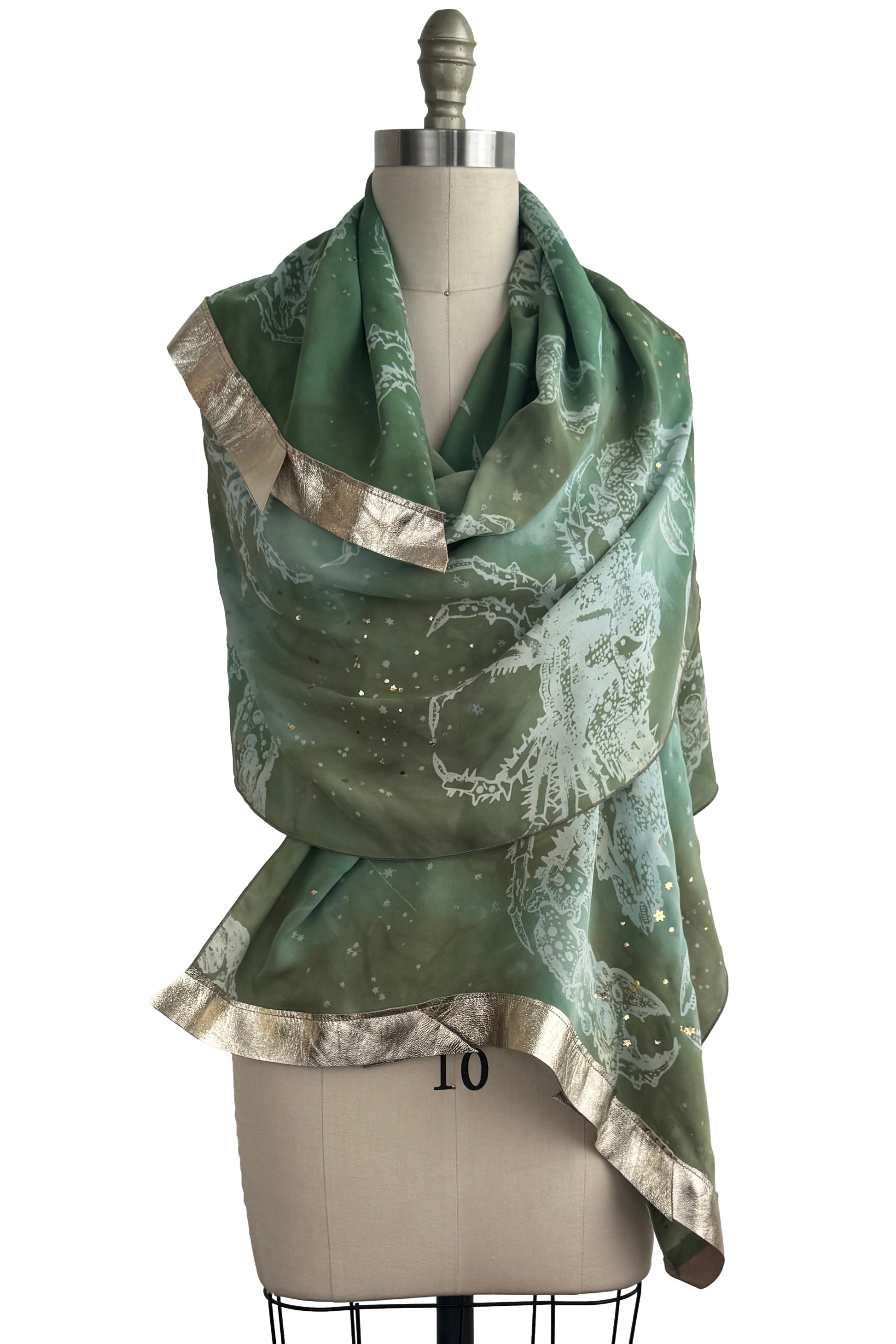 Shawl - Silk Georgette - Leather Trim - Crab Print - Light Green & Gold