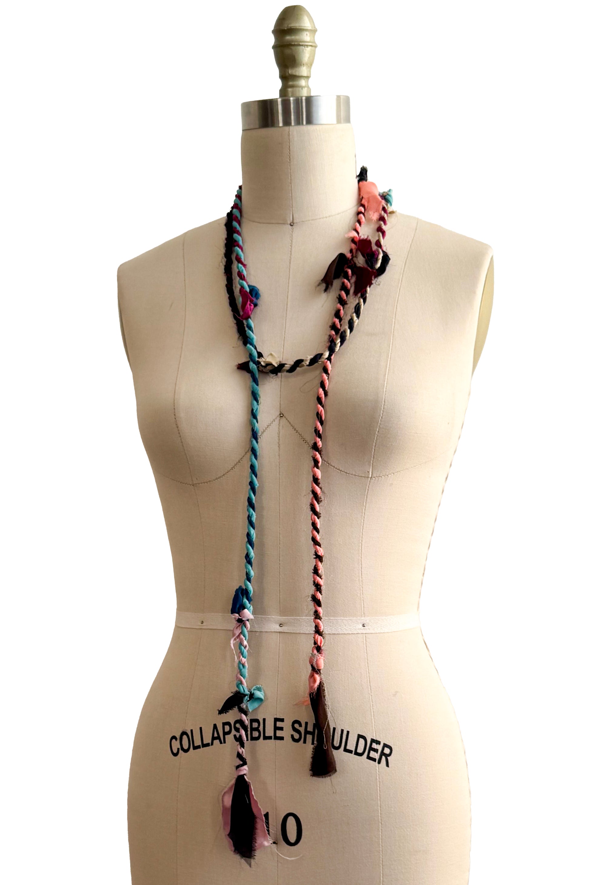 Made from assorted remnants of 100% silk saved from previous dye and garment projects. Soft and lightweight with subtle variation in color and texture, each is completely one of a kind. The silk pieces are prepared and twisted by hand to create structure, then secured at the ends with small finishing details. Colors are chosen intuitively to give the rope movement and tone. Made entirely in studio using zero-waste methods.