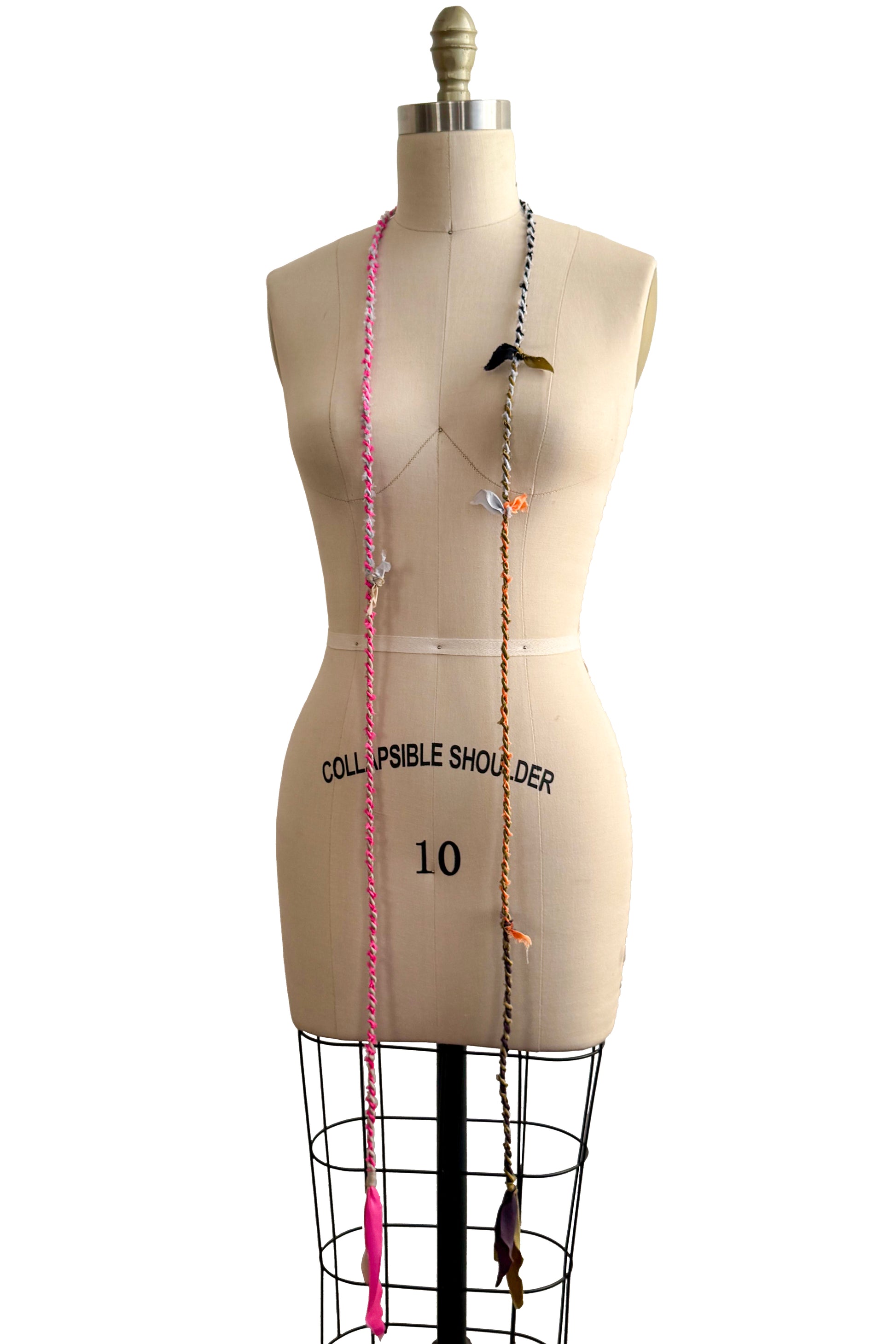 Made from assorted remnants of 100% silk saved from previous dye and garment projects. Soft and lightweight with subtle variation in color and texture, each is completely one of a kind. The silk pieces are prepared and twisted by hand to create structure, then secured at the ends with small finishing details. Colors are chosen intuitively to give the rope movement and tone. Made entirely in studio using zero-waste methods.