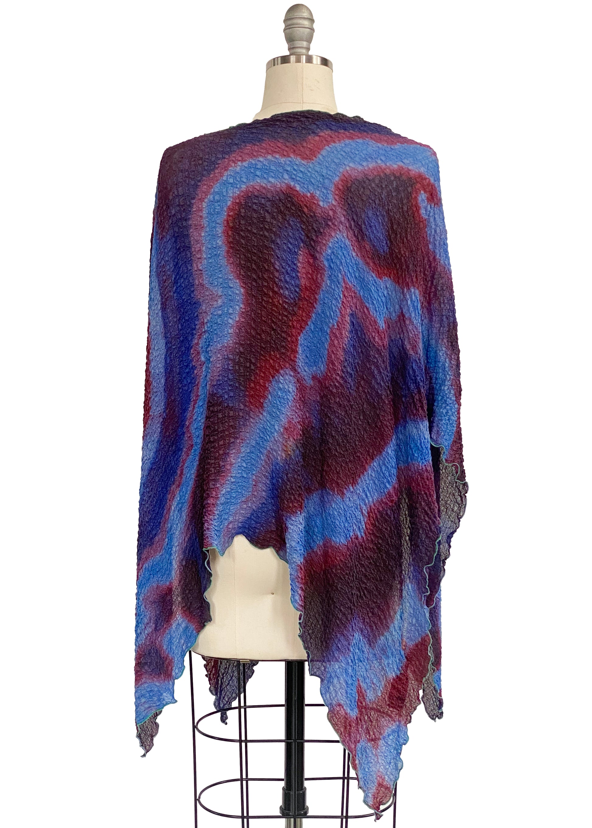 Waffle Silk Poncho w/ Itajime Stick Dye - Blue, Eggplant & Red
